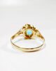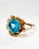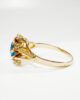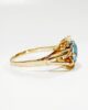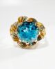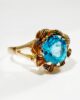 Stunning 40s solitaire ring in 18k yellow gold set with a 3ct brilliant-cut azure blue quartz in a pring setting. The vibrant blue stone is mounted on an open bezel haloed with grooved petals that gradually open up like a flower in full bloom. The two-pronged shoulders come together to form a simple gold ring. A captivating ring that catches the light and the eye.