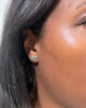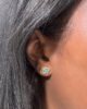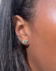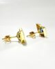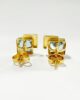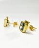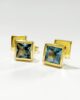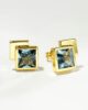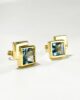 Superb pair of 70s stud earrings in 18 carat gold set with 2 princess cut topazes of 1.5 carats in an intense lagoon blue. Each stone is highlighted by a gold border, juxtaposed on a square gold flat area, bringing sparkle and light to the jewel. An elegant and original piece to wear every day.