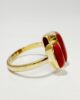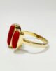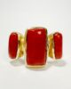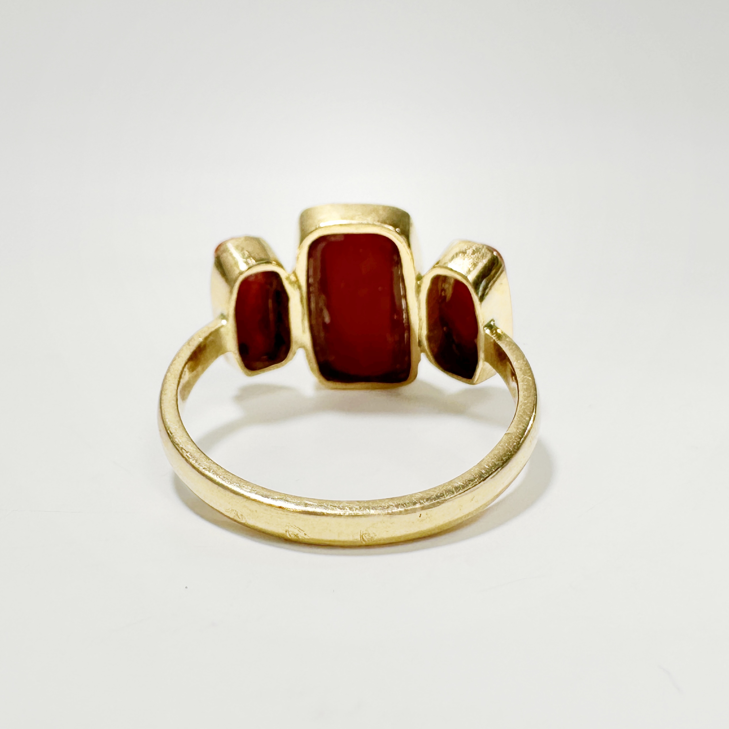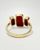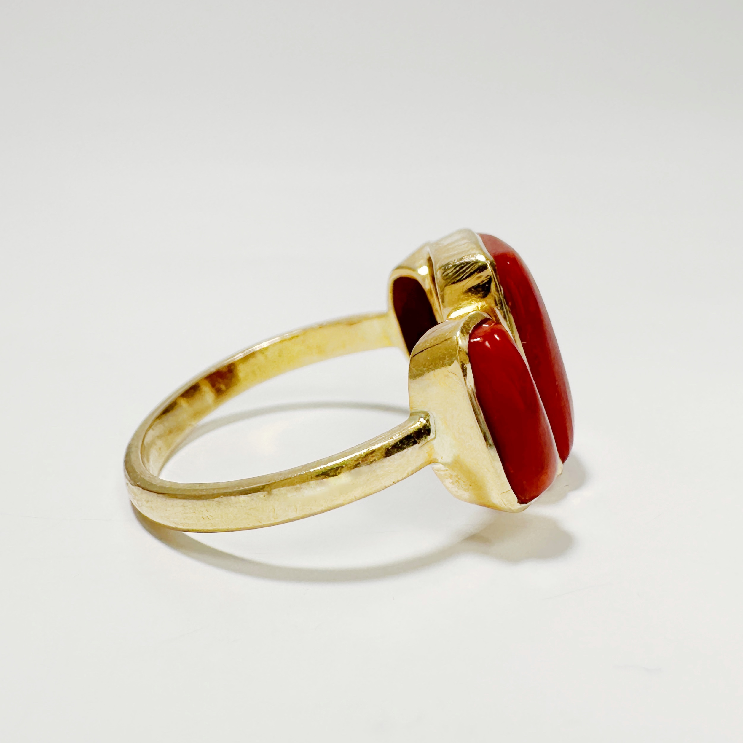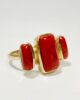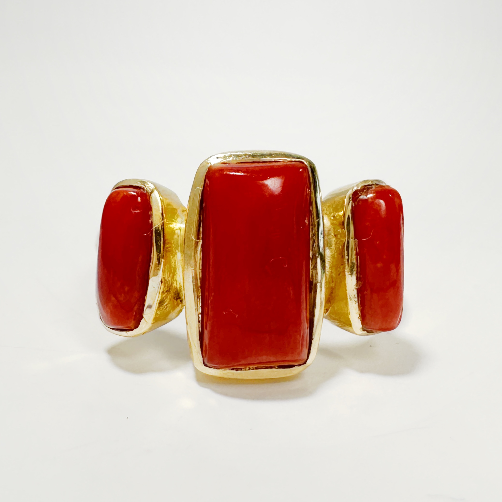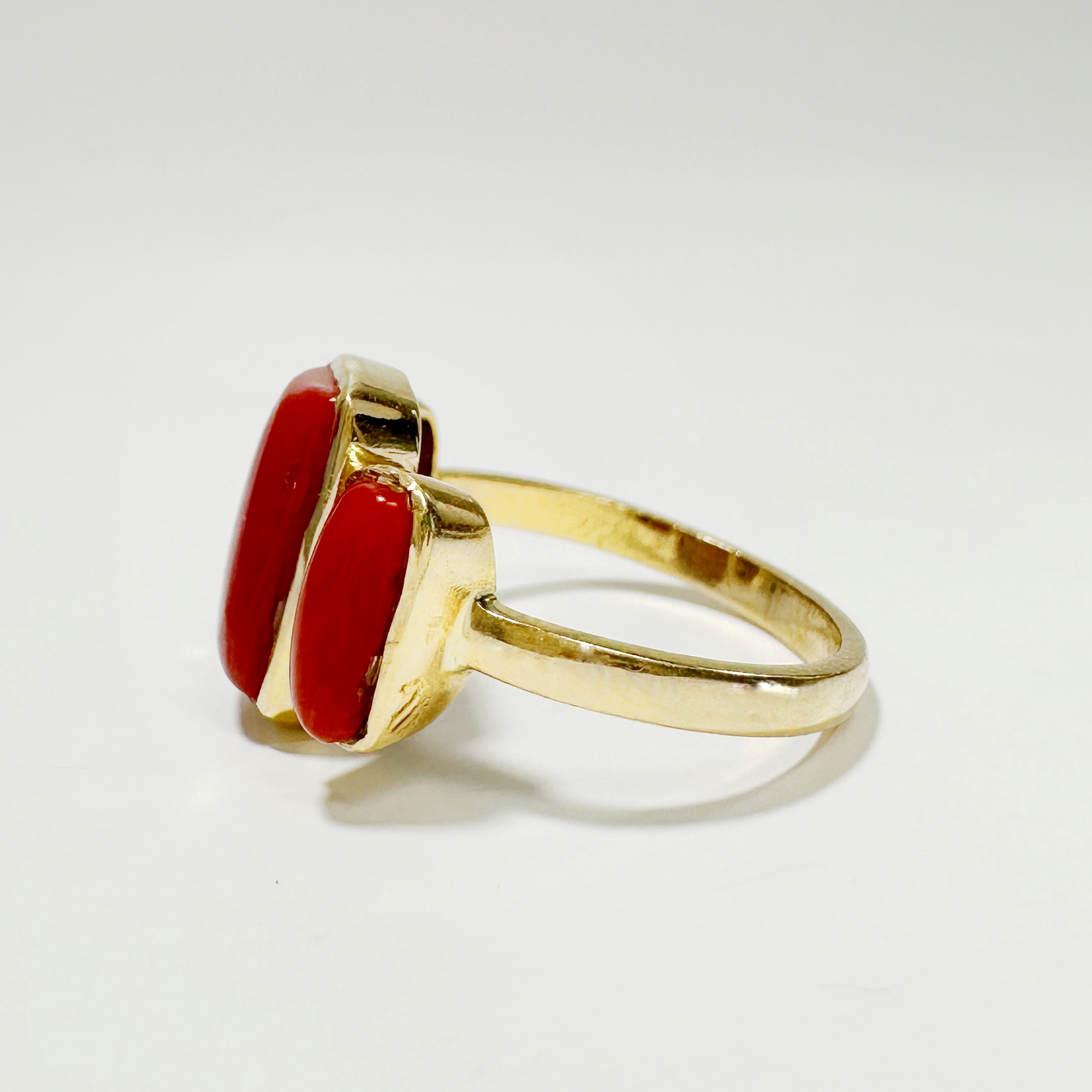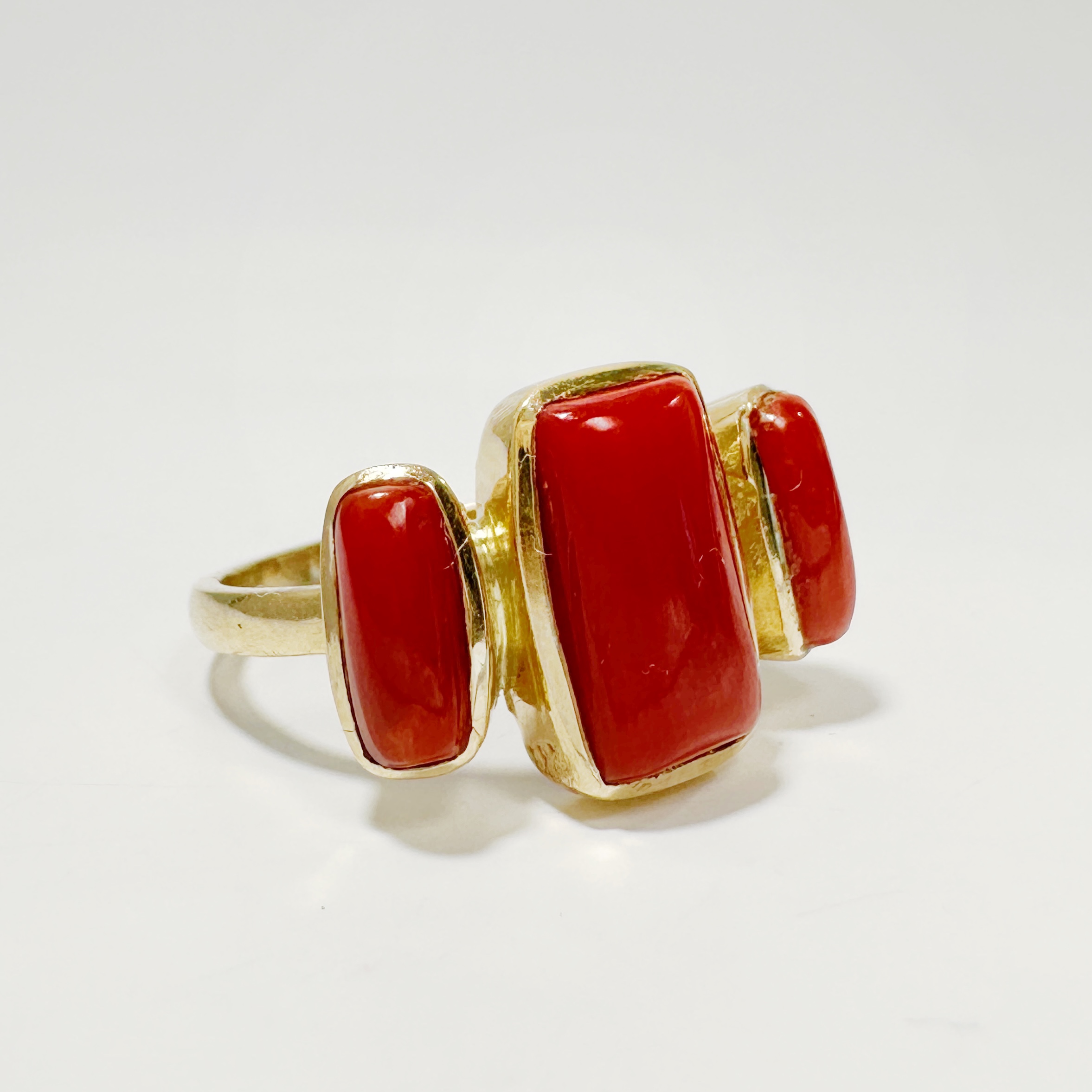 Sublime 50s ring in 18k yellow gold in trilogy style centered with three rectangular shaped coral cabochons, one central of approximately 4 carats and the other two of 2 carats. Vibrant orange-red, the coral cabochons are enhanced by the warmth of yellow gold for a bright and colorful piece.
