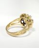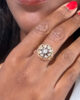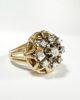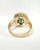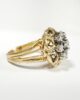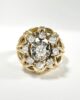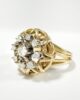 Sublime 50s daisy ring in 18-carat yellow gold set with a 0.15-carat central brilliant-cut diamond haloed with 8 diamonds of 0.05 carats, VVSI clarity and H color. These diamonds are set in white gold and arranged in a daisy style on an openworked yellow gold bezel forming a star motif. On either side of the central motif, three branches come together in a single ring. A bright and sparkling room with a typical charm of the 40s.