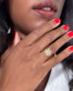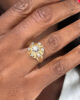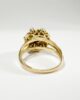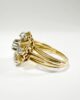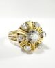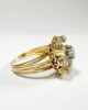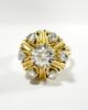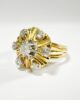 Sublime daisy ring from the end of the 19th century in 18 carat yellow gold set with a central brilliant-cut diamond of 0.15 carats, VVSI clarity and H color (probably the replacement of a rose-cut diamond originally) haloed with 6 rose-cut diamonds of 0.5 carats. These diamonds are set in white gold and arranged in a daisy style on a yellow gold bezel forming a solar motif. On either side of the central motif, three branches come together in a single ring. A bright and sparkling room with a typical charm of the 40s.
