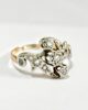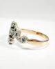 This sublime trilogy ring from the late nineteenth century in 18-carat pink gold features a succession of 3 rose-cut diamonds of approximately 0.02 carats in grain-setting on white gold embraced by two lines with plant motifs each set with 4 rose-cut diamonds of 0.01 to 0.02 carats. This central motif in dazzling whiteness joins a rose gold band for a beautiful, elegant and feminine contrast. A refined piece typical of the Bonaparte period.