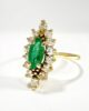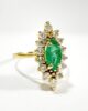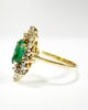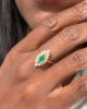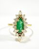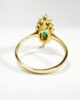 Sublime marquise ring from the early twentieth century in 18-carat yellow gold featuring a 0.9-carat marquise-cut emerald haloed with 14 brilliant-cut diamonds of 0.03 carats. All in finesse, this delicate ring presents an emerald of a vibrant color and a sublime garden. A classic piece that captures the light and the gaze instantly by the vibrance of its central stone contrasting with the fire of its diamonds,
