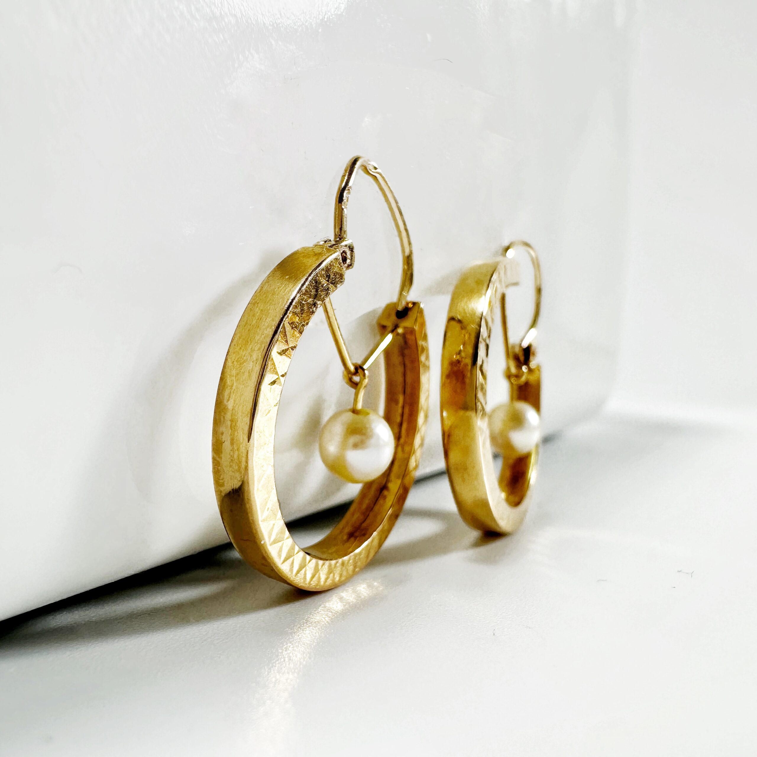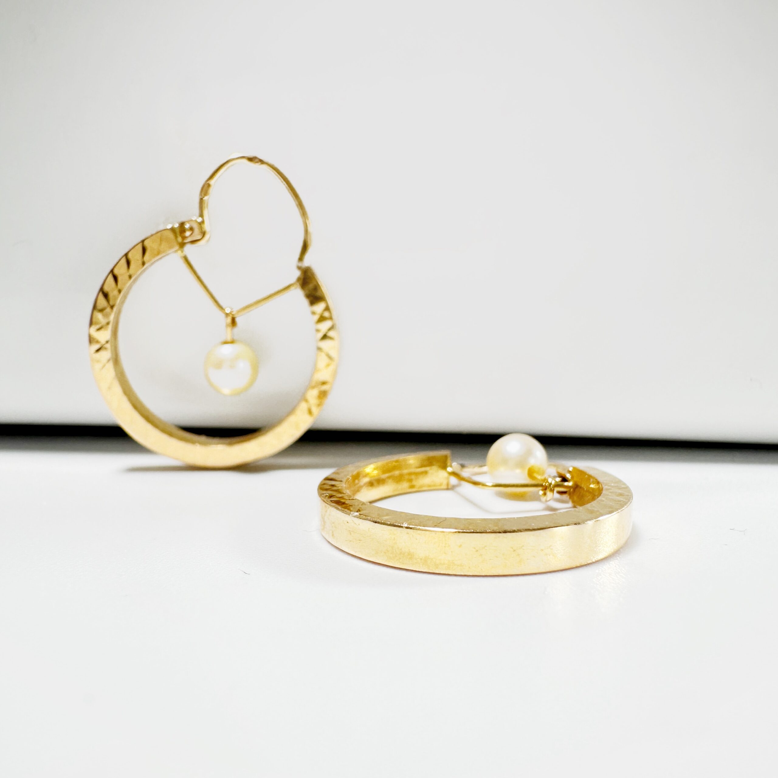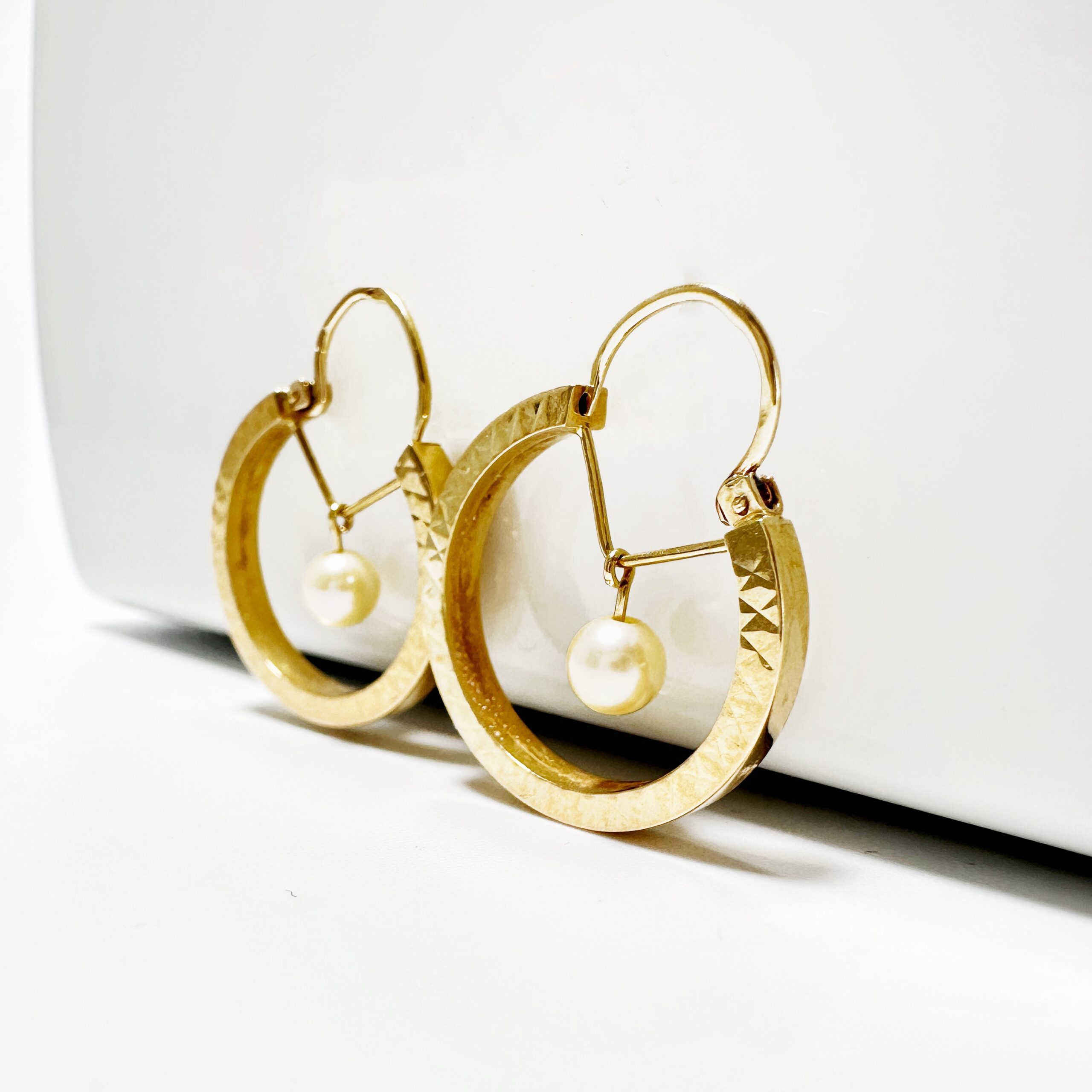 Stunning pair of 18k gold 70s hoop earrings featuring engravings on the side for the most glittering effect, while a pearl mounted like a charm in its center brings light and movement to the piece. Secured by a hinged clasp for the easiest on and off. The must-have and timeless pair of earrings, a classic to have in your jewelry collection.