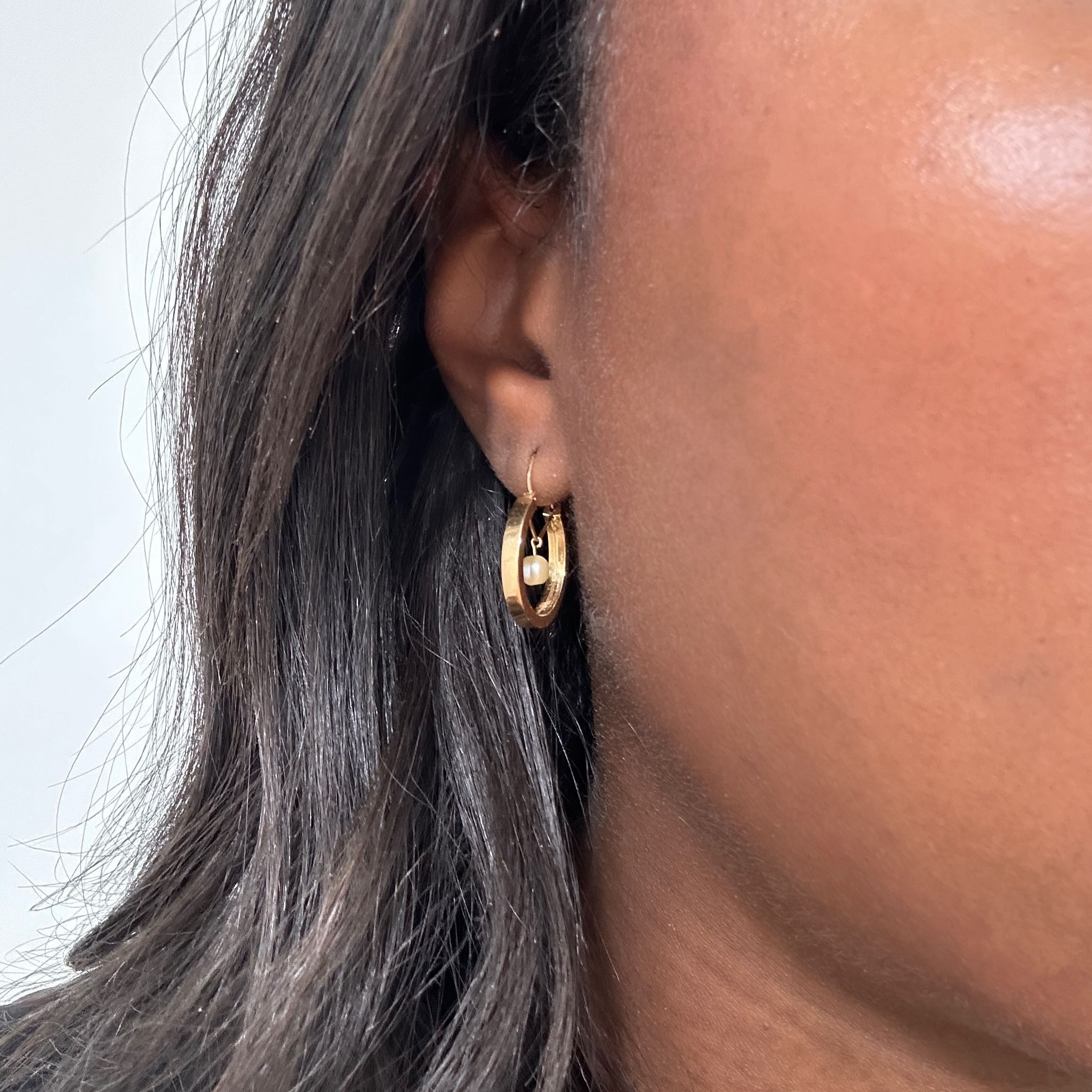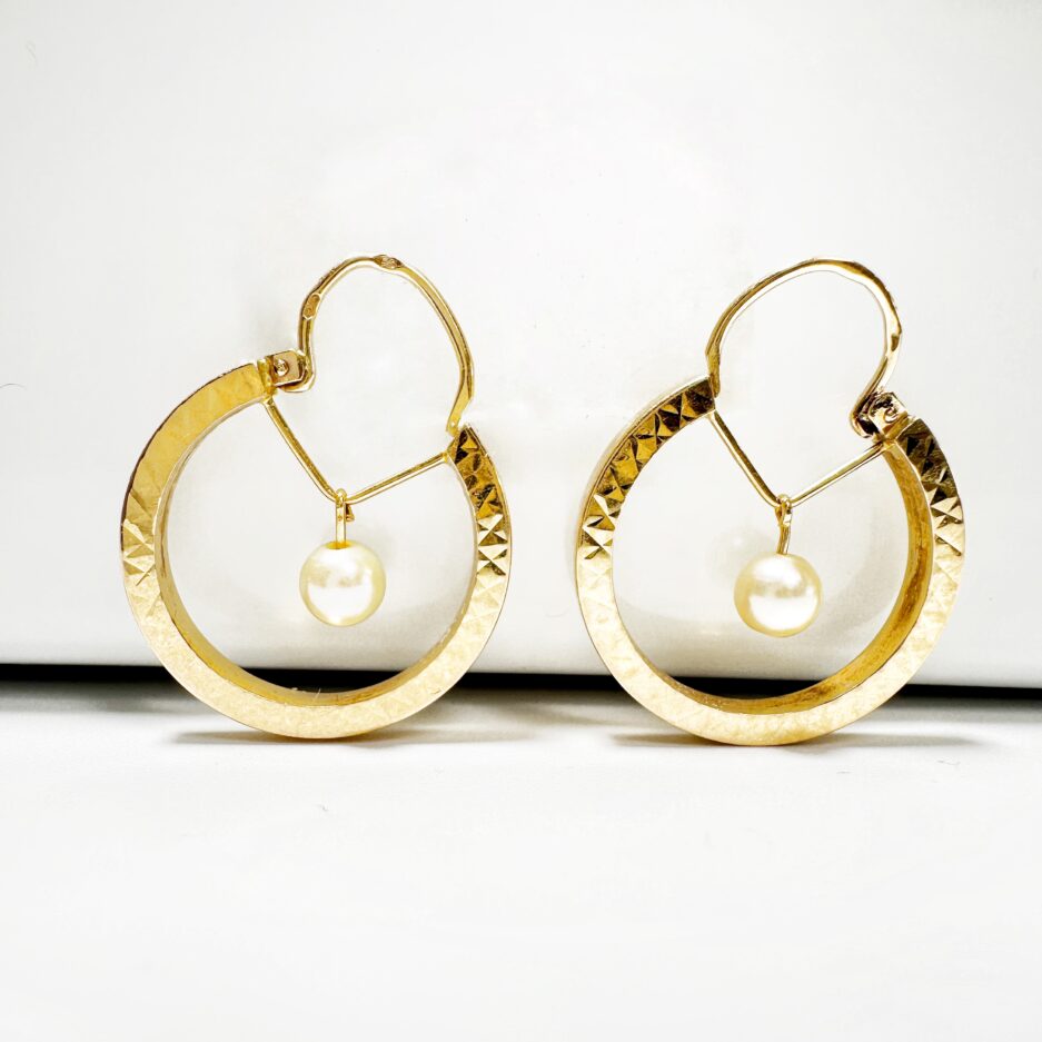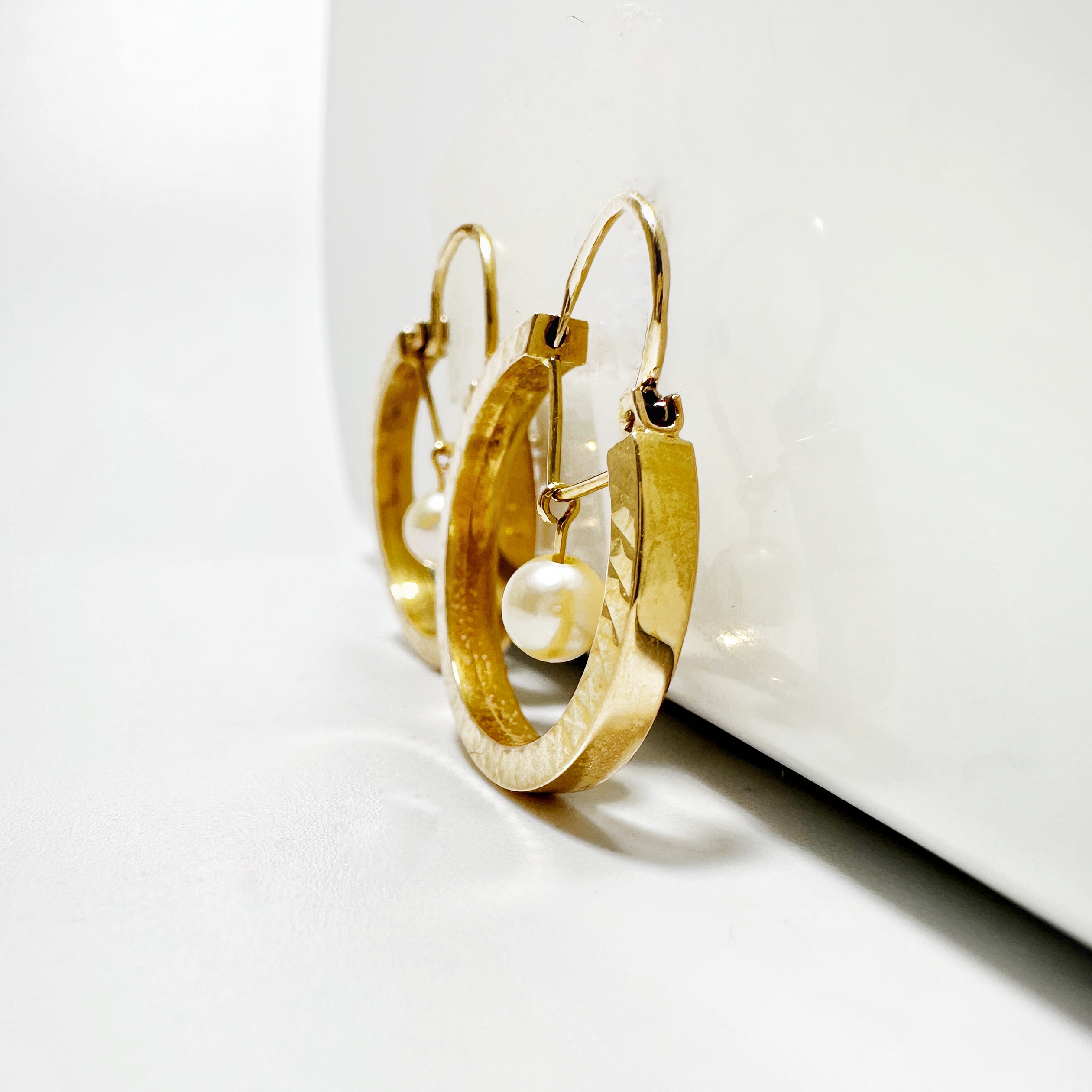 Stunning pair of 18k gold 70s hoop earrings featuring engravings on the side for the most glittering effect, while a pearl mounted like a charm in its center brings light and movement to the piece. Secured by a hinged clasp for the easiest on and off. The must-have and timeless pair of earrings, a classic to have in your jewelry collection.