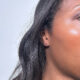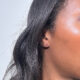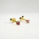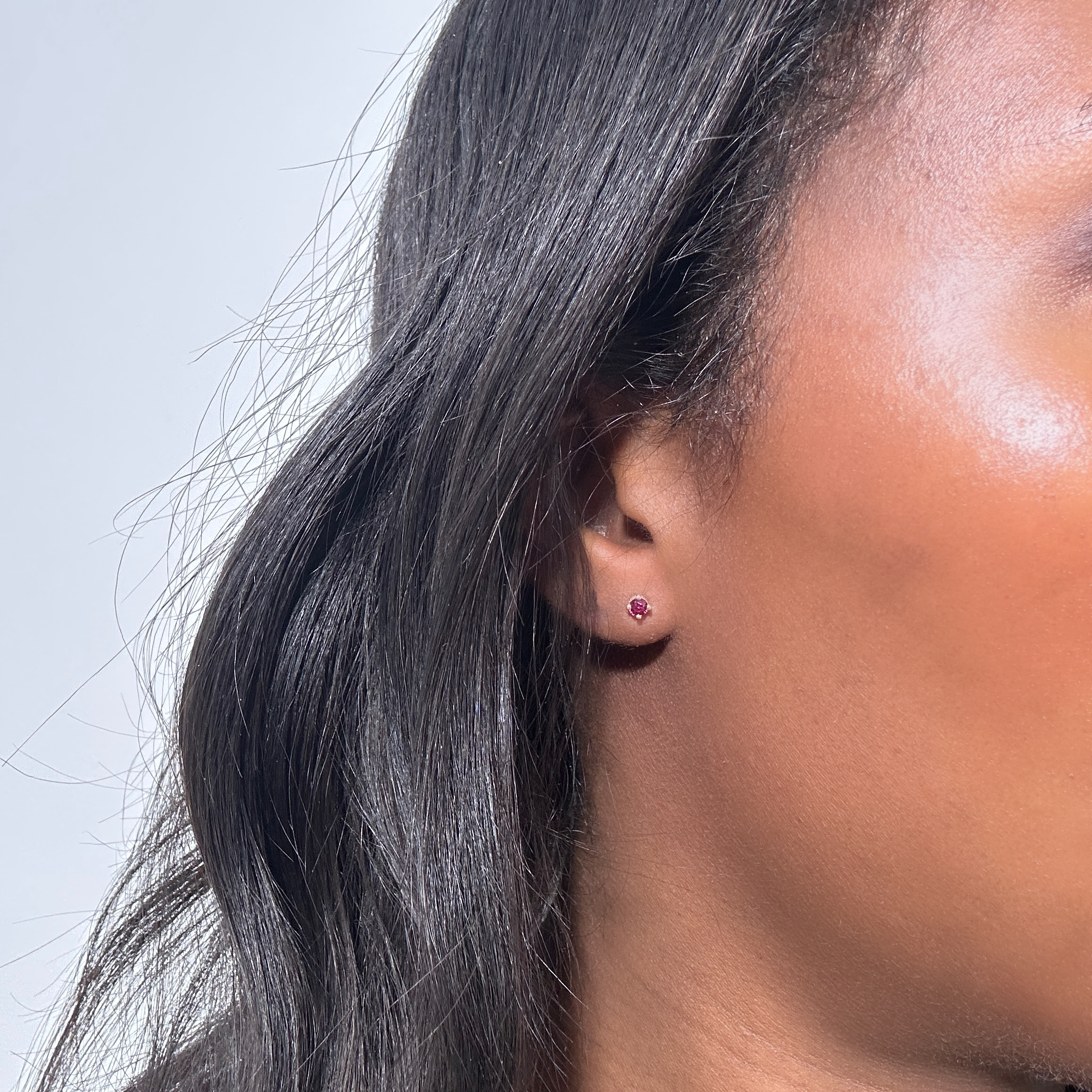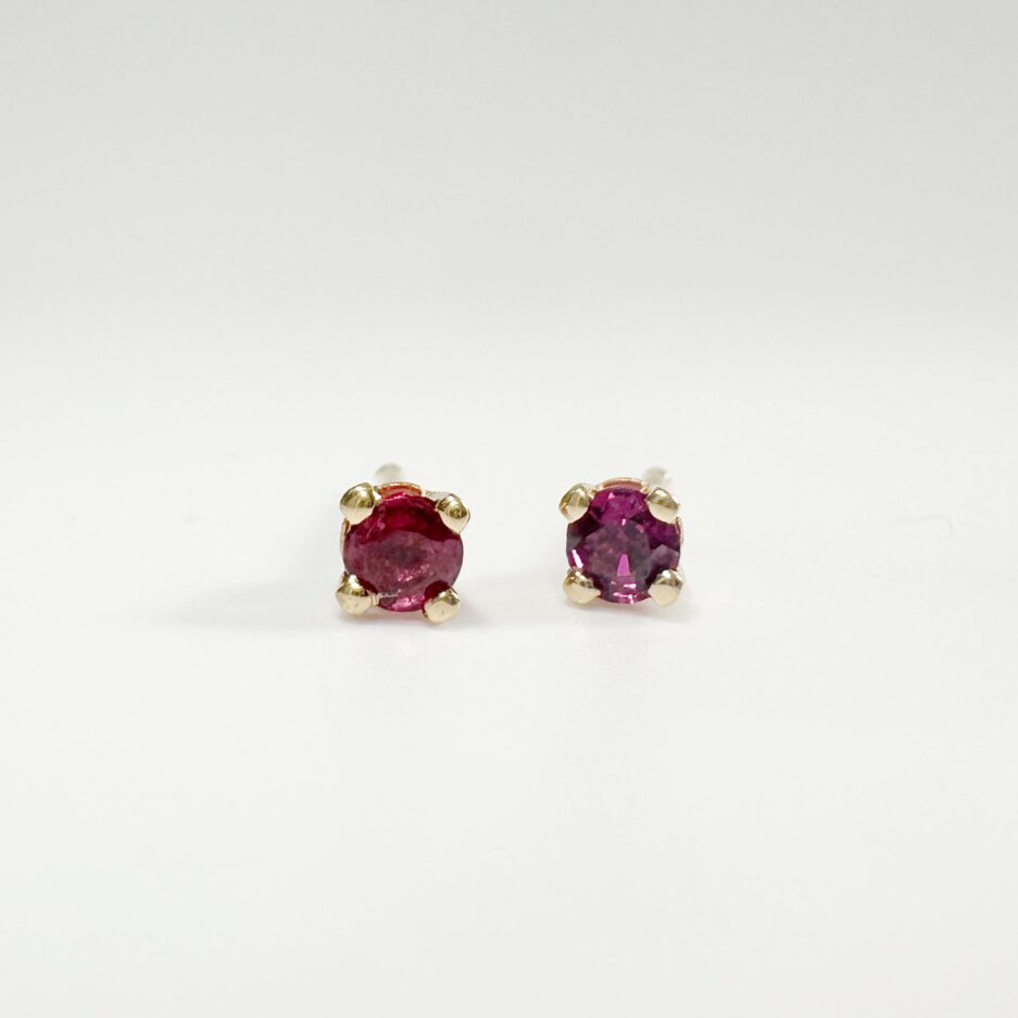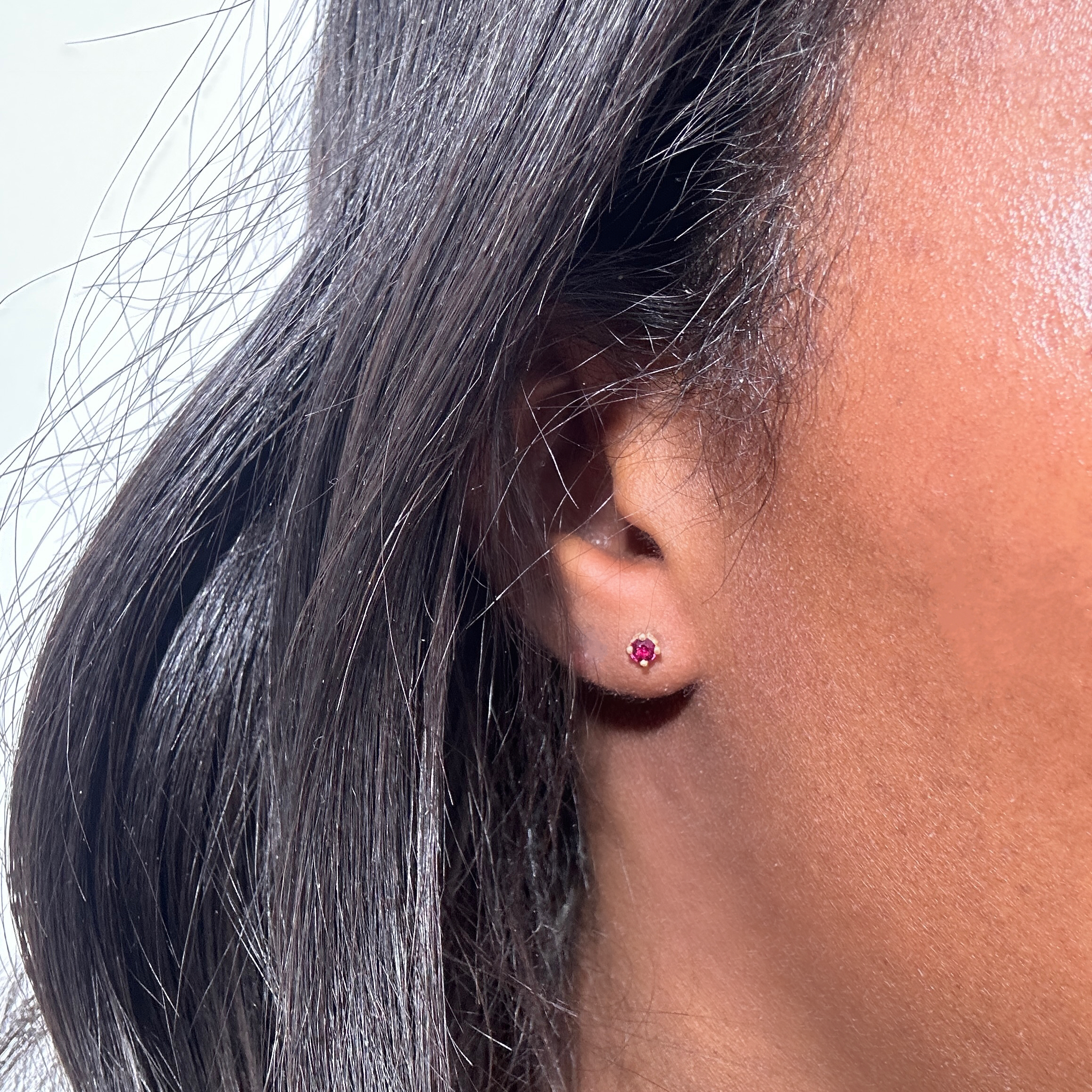 This adorable pair of solitaire style stud earrings dates back to the 50s. Made of 18-carat gold, it features a brilliant-cut wine colored ruby weighing approximately 0.15 carats. A delicate piece to wear alone or layered with other earrings, and which will suit both an adult and a child. Note that the two butterfly clasps are not perfectly identical.