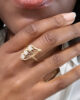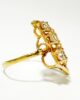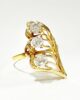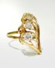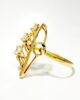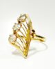 Sublime 18k gold ring from the 50s featuring a succession of 3 brilliant-cut white sapphires of 0.4 carats of luminous white and bright fire. The three prong-set stones in the centre of the ring follow one another in steps on an openwork bezel worked like a feather or a butterfly’s wing. A feminine and delicate piece, all in finesse and brilliance.