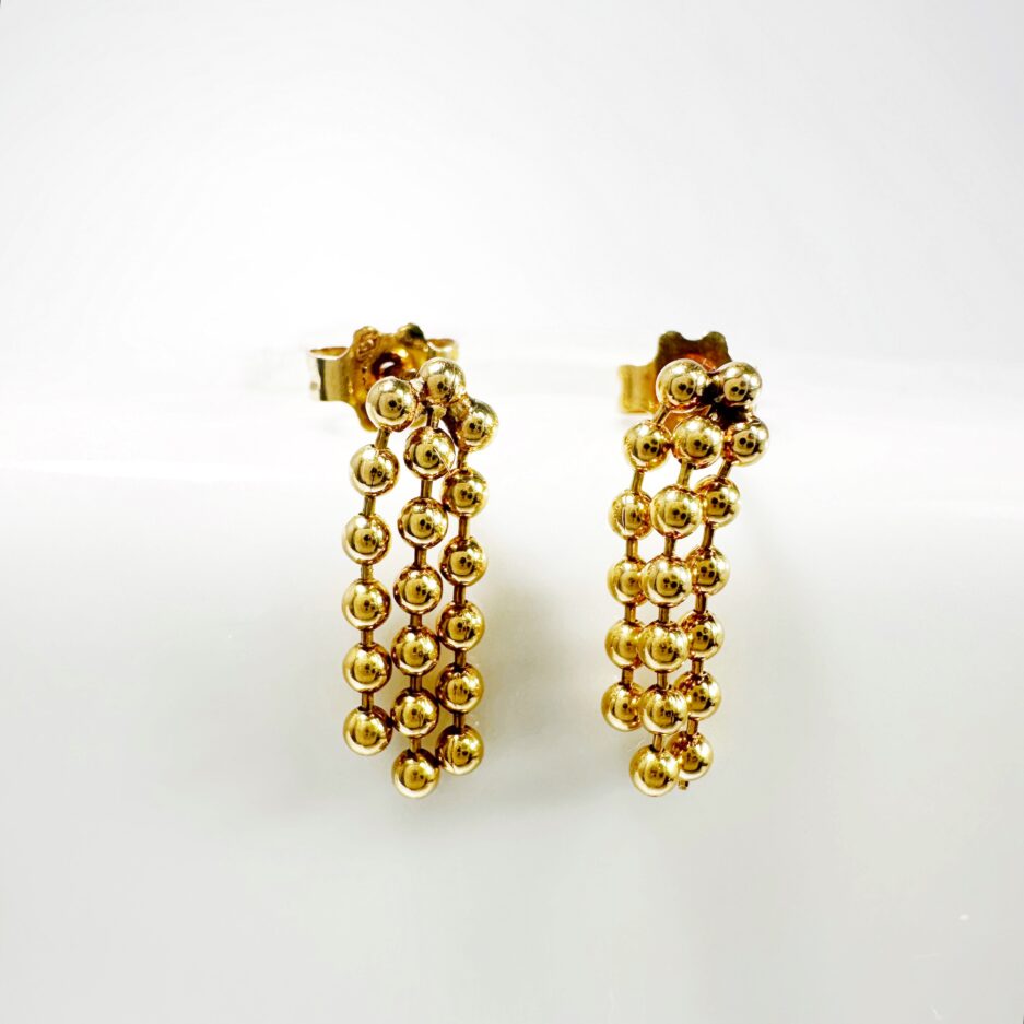 Sublime pair of 18k gold dangling earrings from the 70s featuring 3 lines of soft gold beads. All in motion, they offer an exceptional brilliance and play of light. A refined piece to wear to complete your most sophisticated outfits or bring a touch of elegance to your everyday outfits.