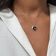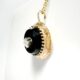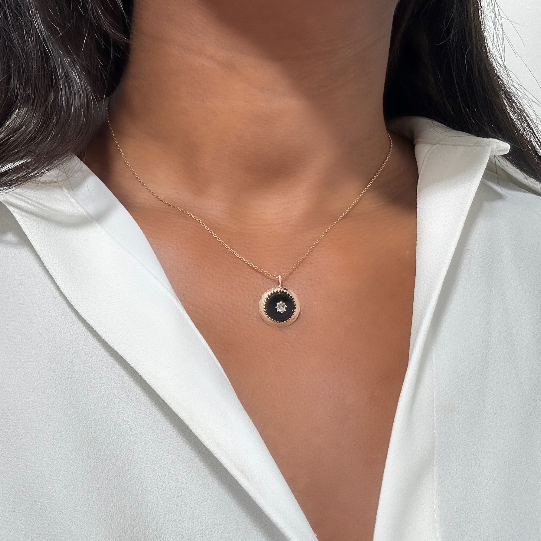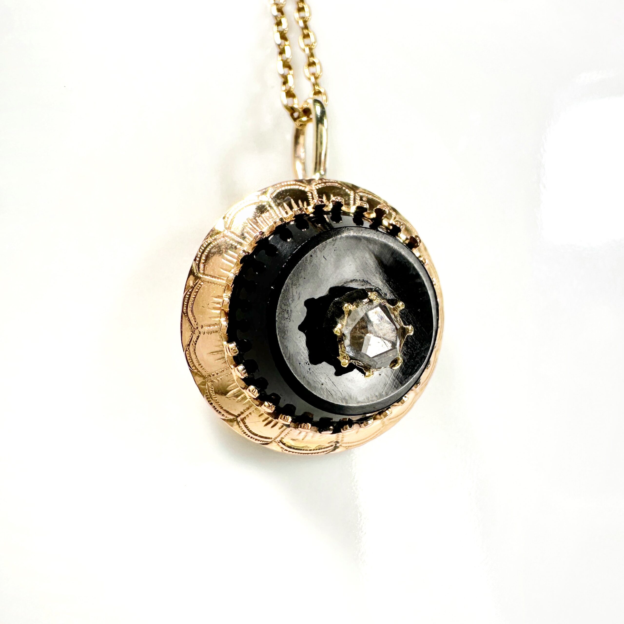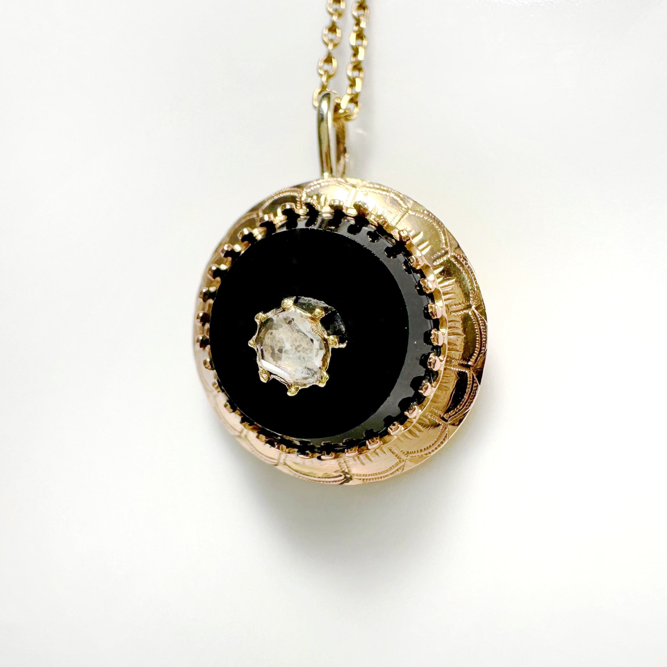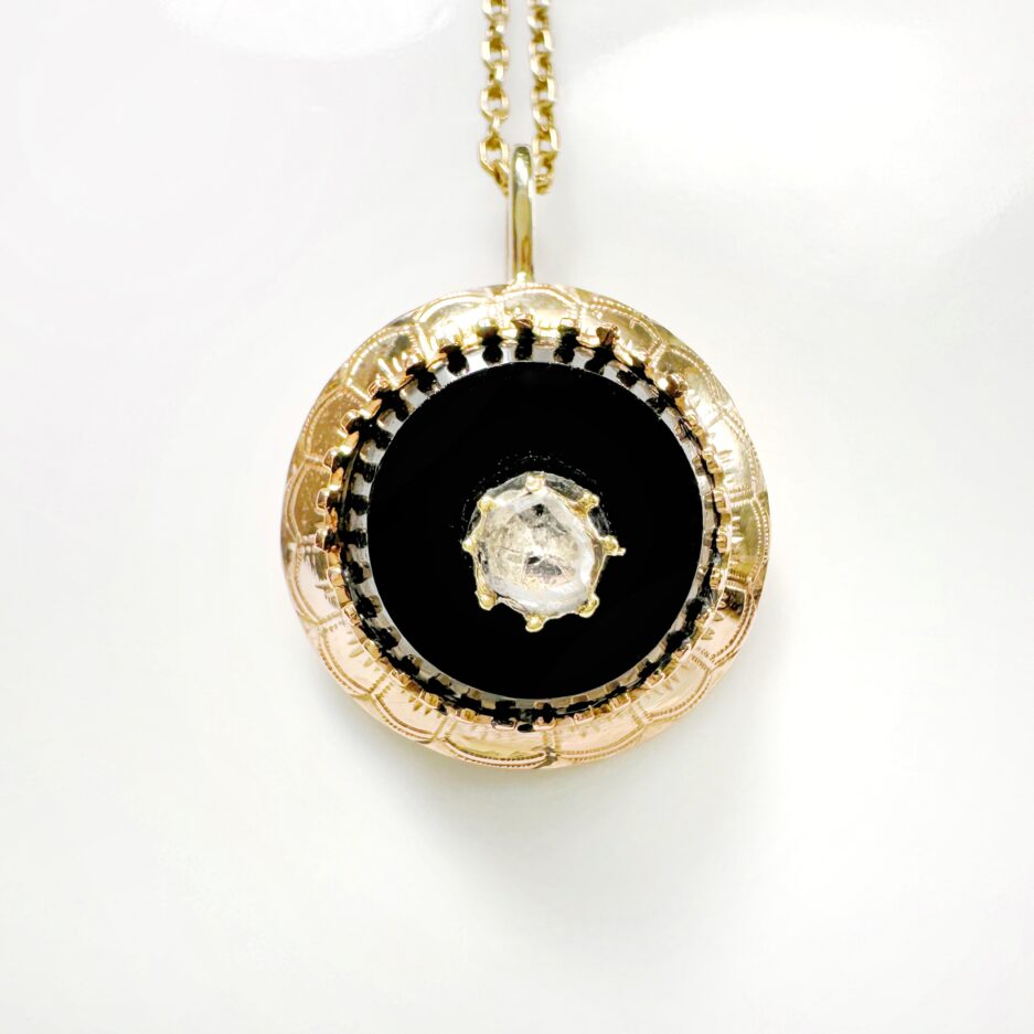This new TransfÓ or transformation by ÓNÍSÌ PARIS is an old tie pin from the nineteenth century converted into a pendant with an invisible bail. The pendant consists of a round onyx plate on which is set a 0.1 carat rose-cut diamond in a prong setting. A chiseled gold border brings light and contrast to the onyx, which is also retained as a claw. A unique piece where the contrast of yellow gold and black onyx is highlighted by the whiteness of the diamond.