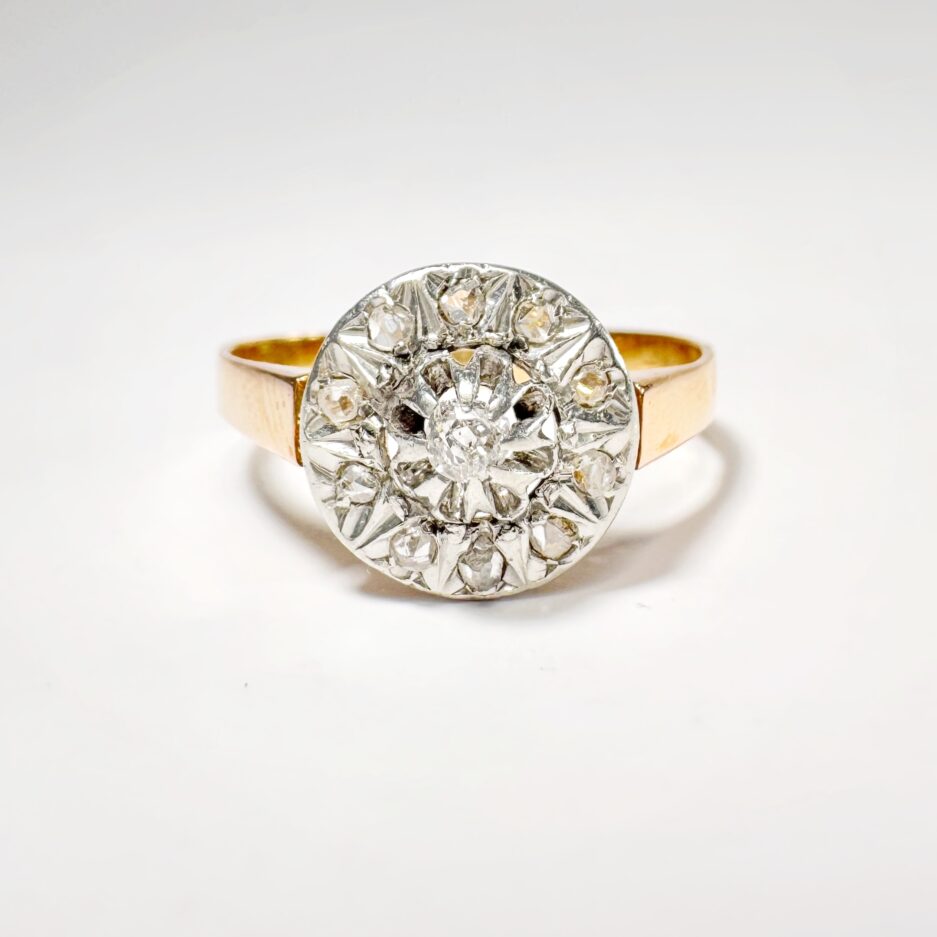 Sublime ring from the 20s 18 carat yellow gold centered on a platinum disc set with a sublime 0.10 carat VVSI old cut diamond and H color (almost colorless) haloed with 10 rose-cut diamonds. Mounted on a chiseled bezel for optimal shine, this elegant and romantic piece will accompany you on a daily basis.