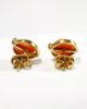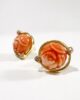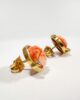 Sublime pair of 18k yellow gold stud earrings from the 30s featuring a central coral motif cut in rose flower encircled by a gold disc set with two 8×8 cut diamonds. With a delicate marbled color ranging from peachy pink to angel skin, coral is enhanced by the warmth of yellow gold and the sparkle of diamond for a romantic and luminous piece.
