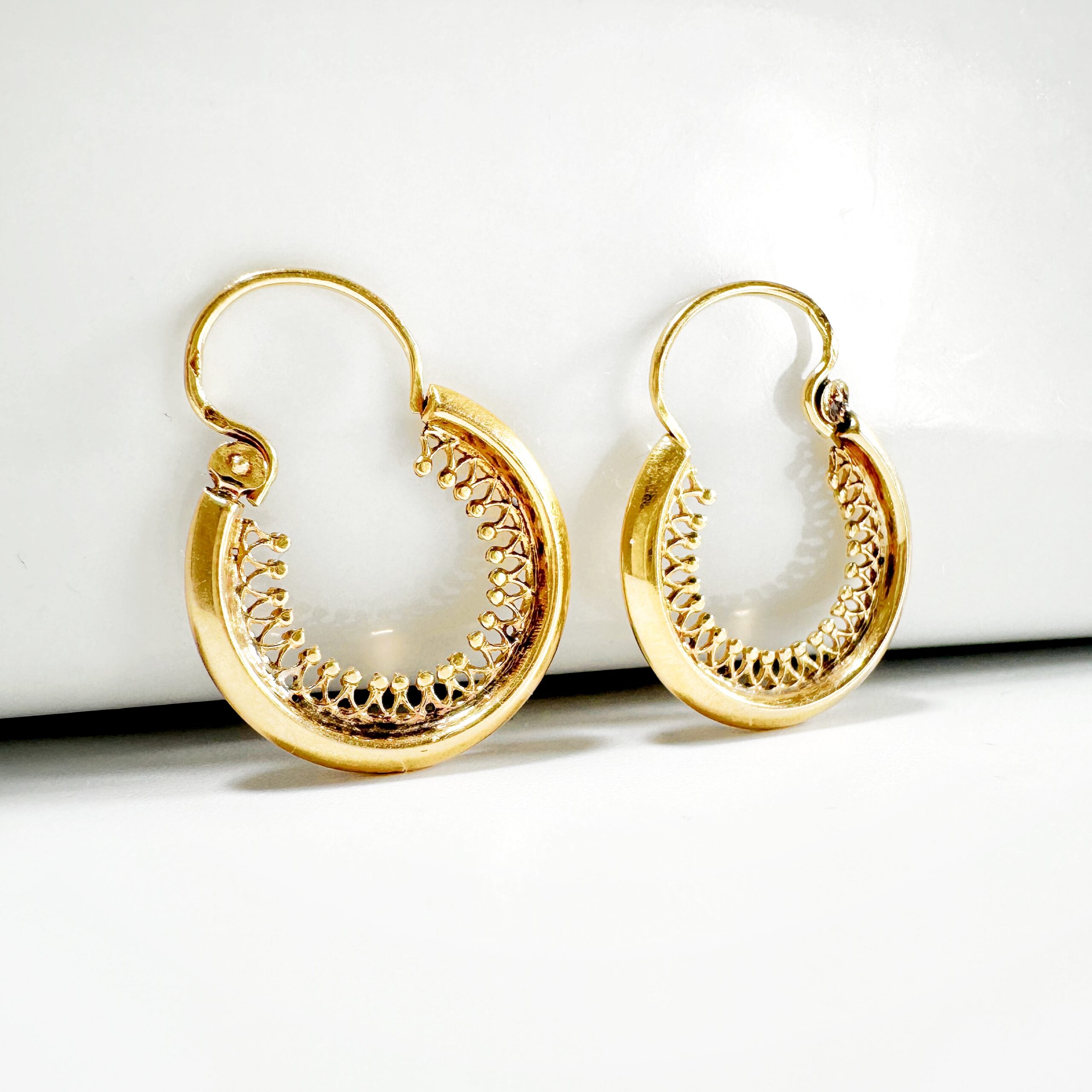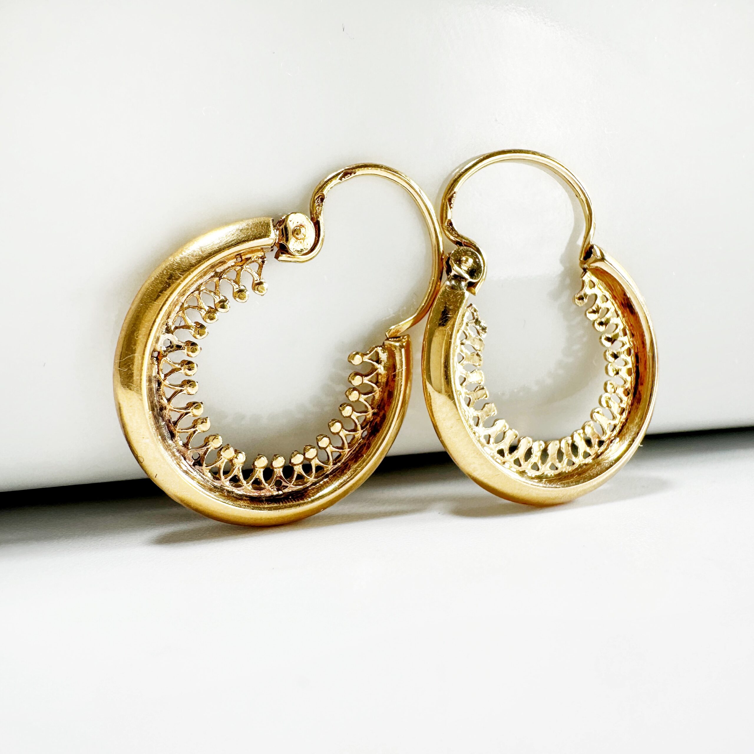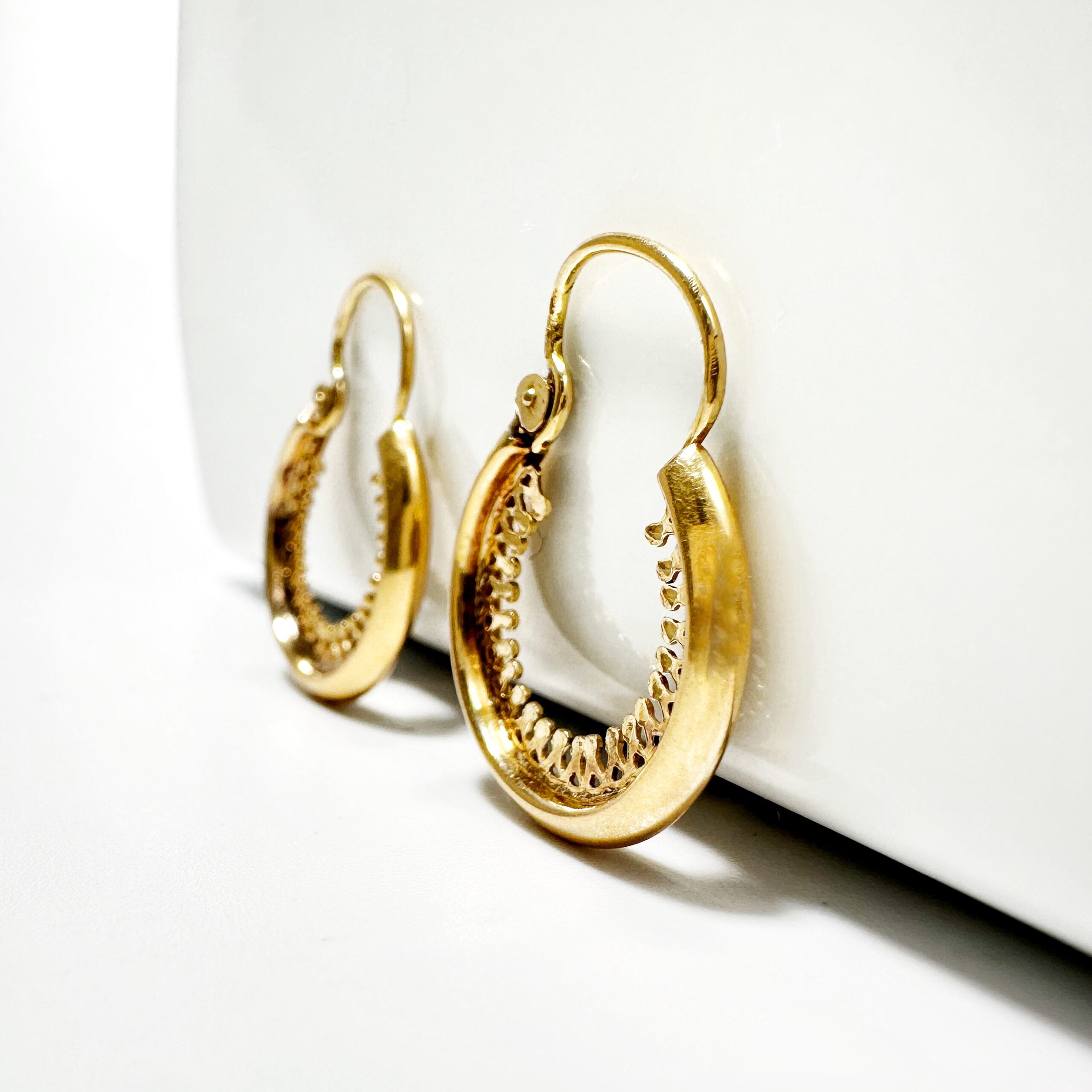 Superb pair of hoop earrings from the 50s in 18 carat gold, whose inner rim is entirely finely chiseled. Secured by a hinged clasp for the easiest on and off, this must-have and timeless pair of earrings will become a must-have in your jewelry collection.