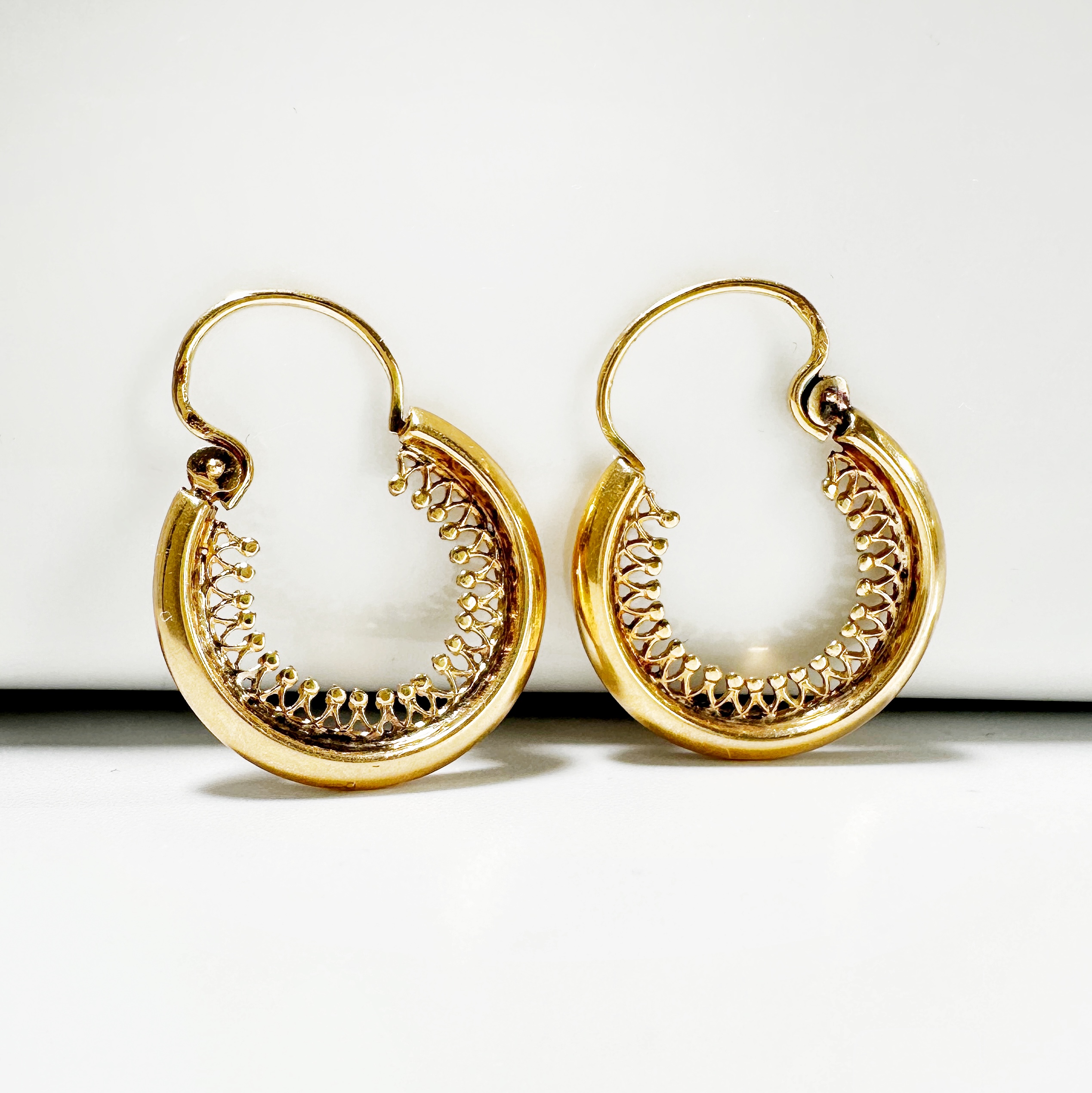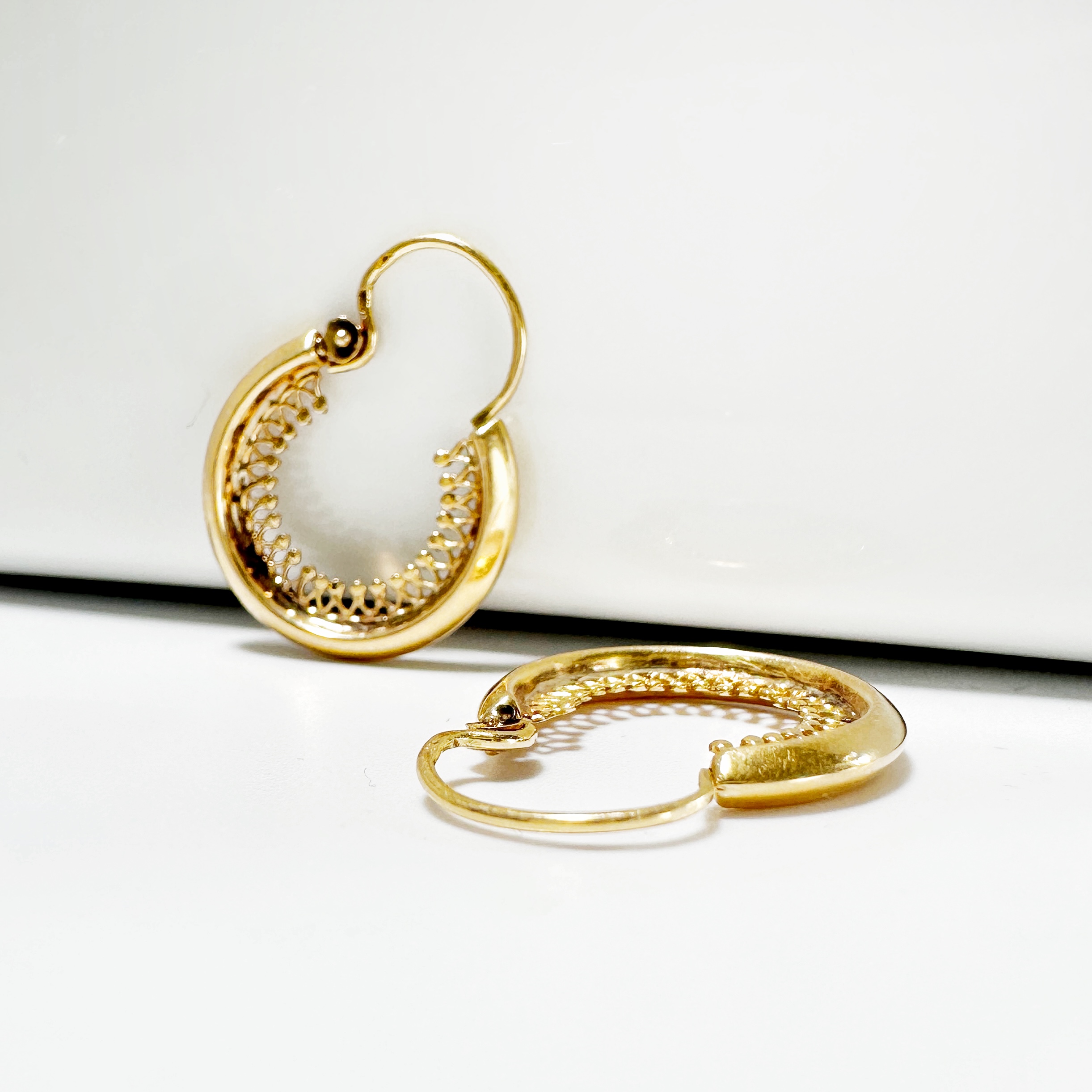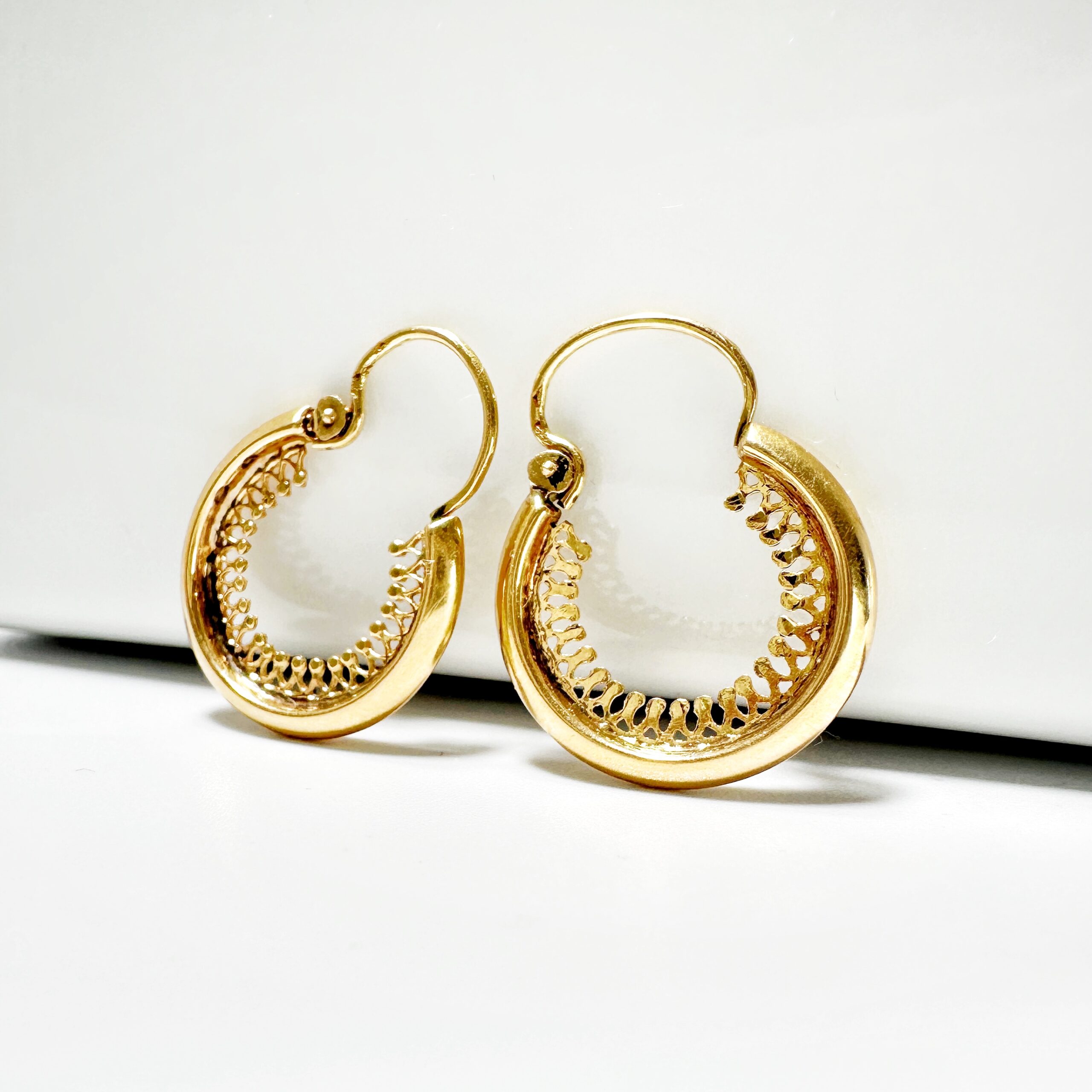 Superb pair of hoop earrings from the 50s in 18 carat gold, whose inner rim is entirely finely chiseled. Secured by a hinged clasp for the easiest on and off, this must-have and timeless pair of earrings will become a must-have in your jewelry collection.