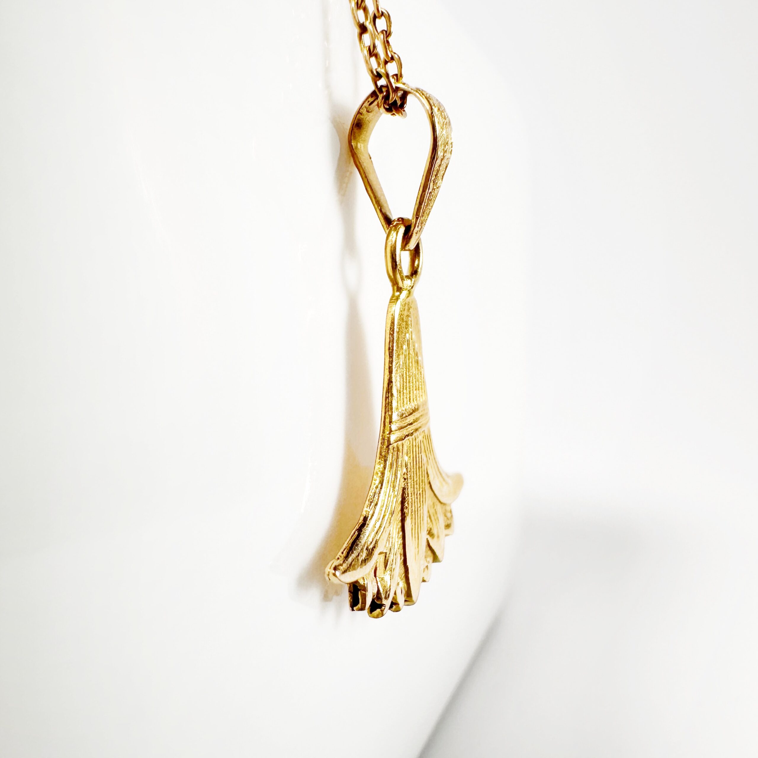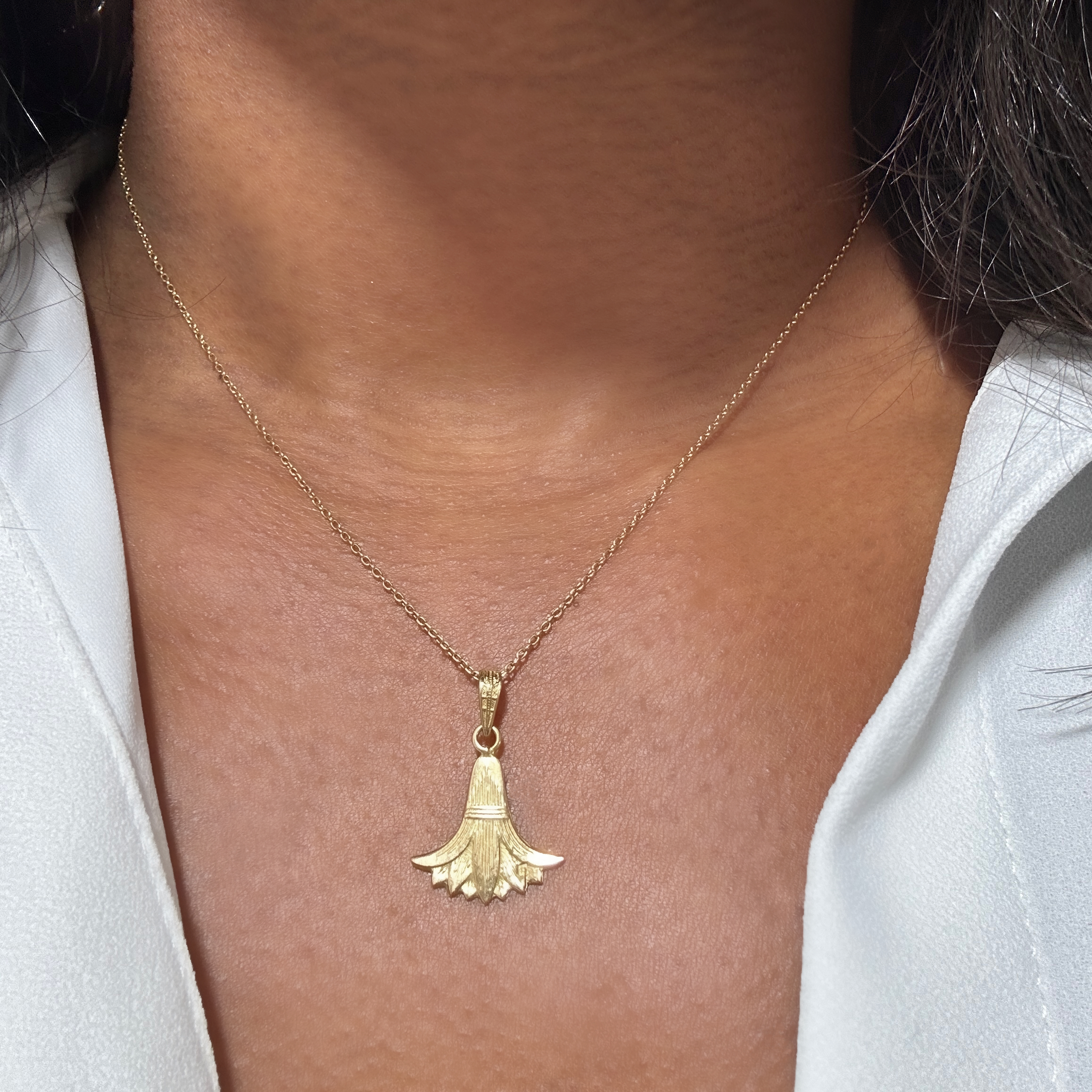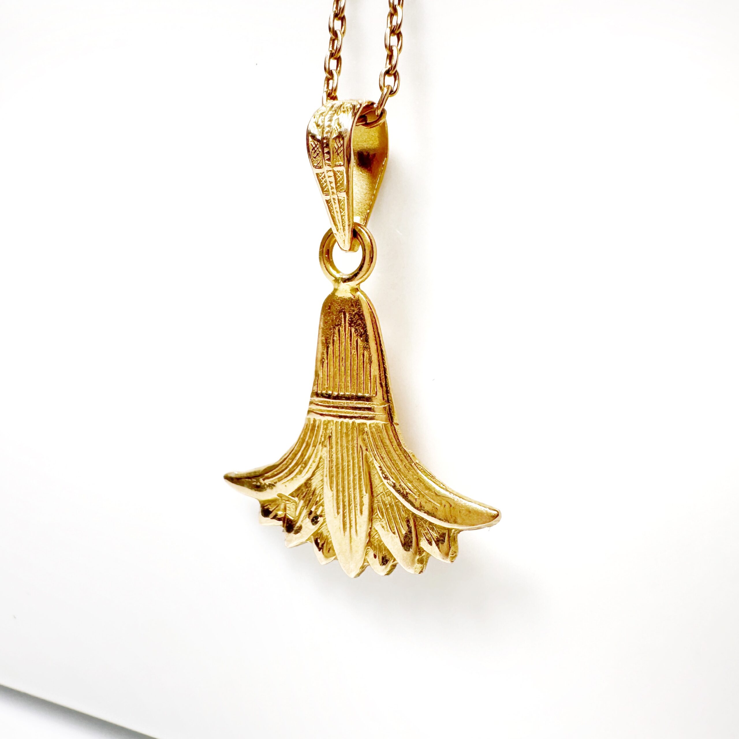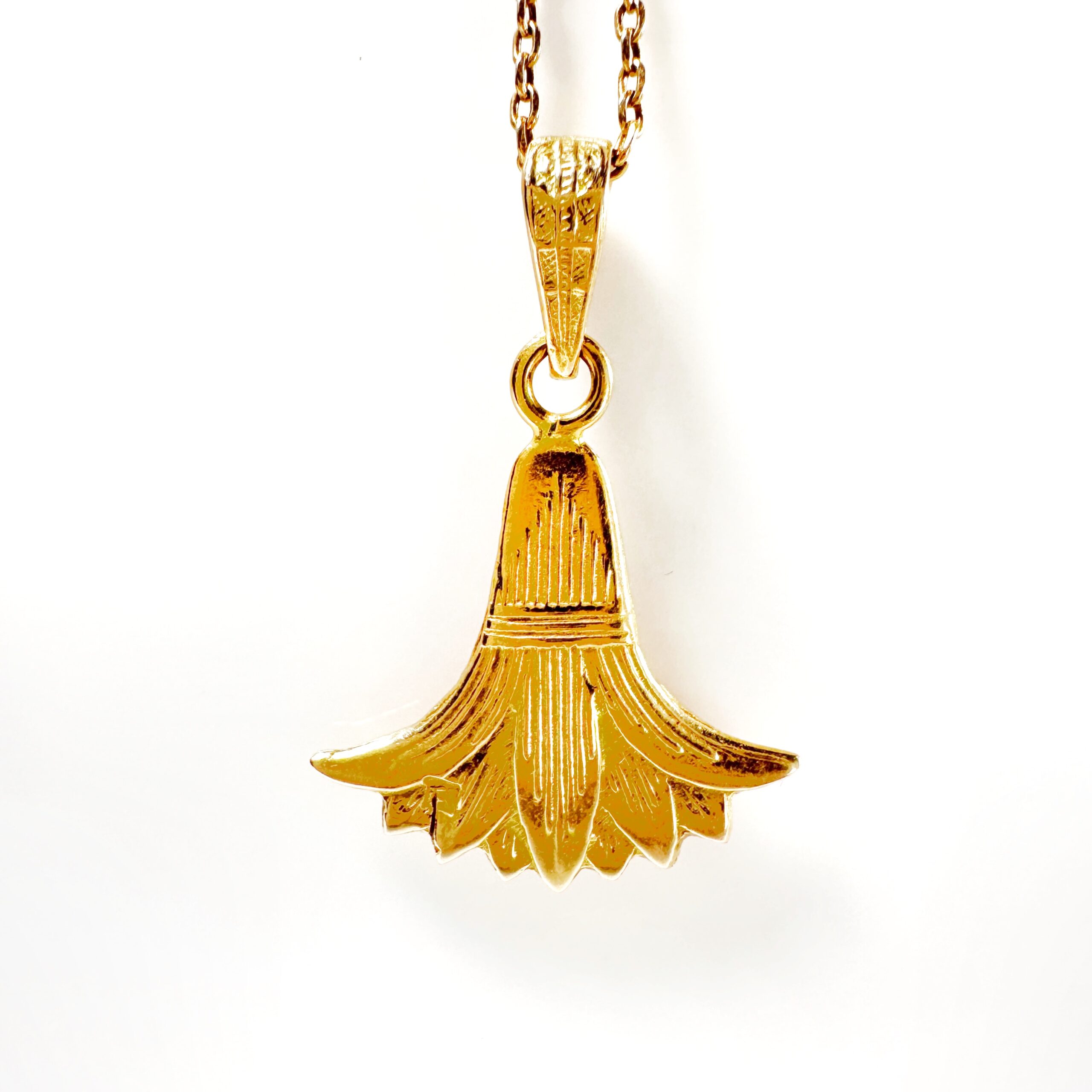 Sublime pendant from the 60s in 18-carat gold representing a lotus flower all in gold, worked in contrast of matte gold and shiny chiseled gold. Held in place by a movable bail with Egyptian motifs, this lucky piece will accompany you around the neck alone or layered with other Egyptian pendants.