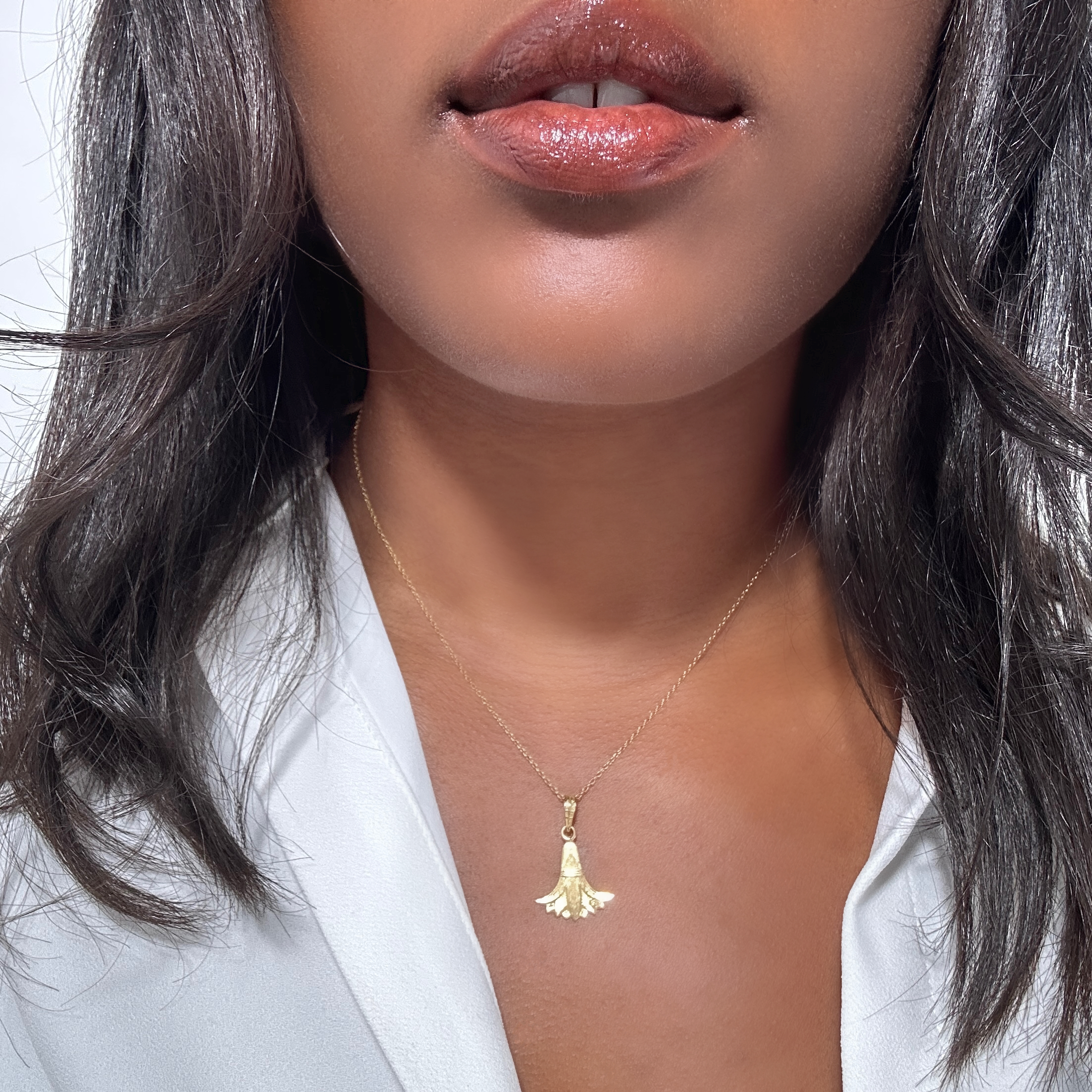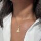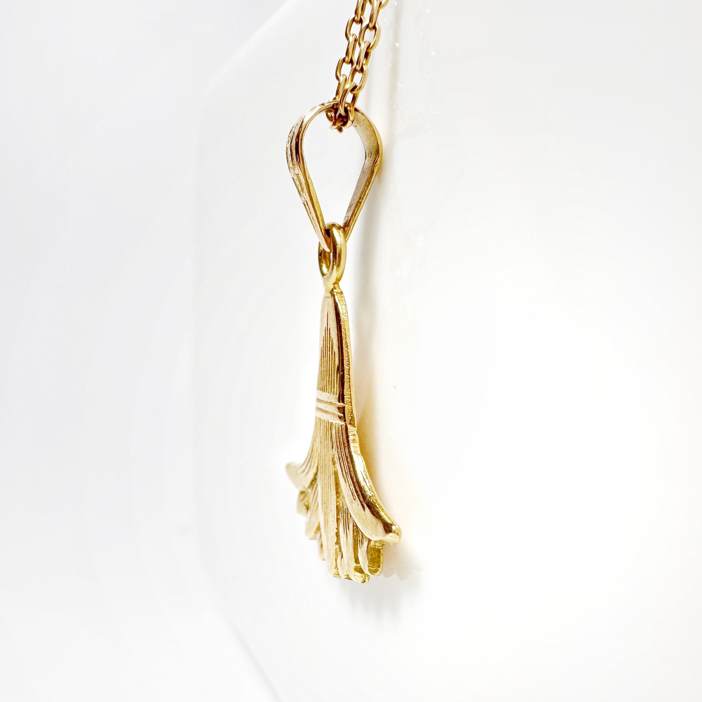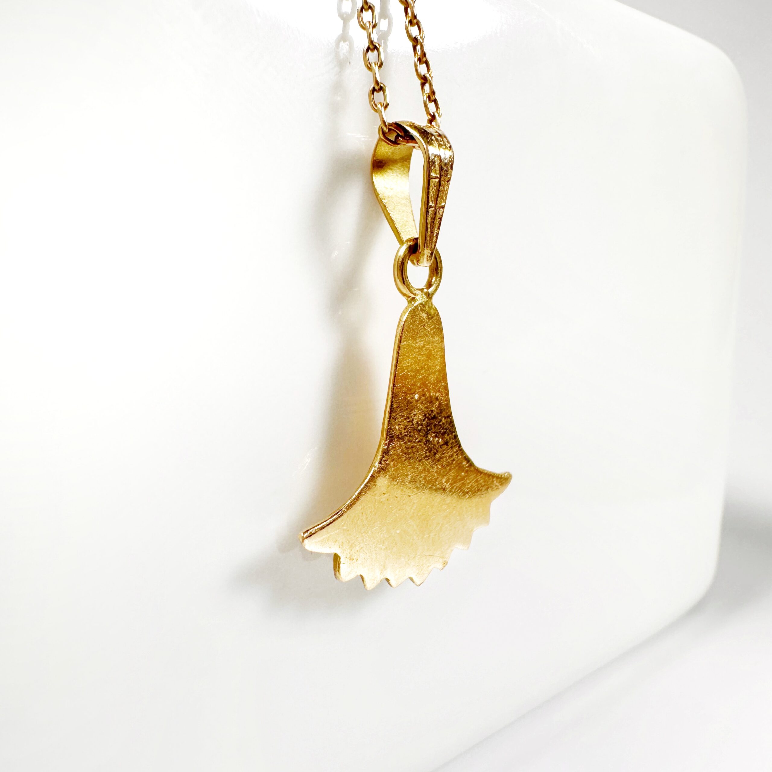 Sublime pendant from the 60s in 18-carat gold representing a lotus flower all in gold, worked in contrast of matte gold and shiny chiseled gold. Held in place by a movable bail with Egyptian motifs, this lucky piece will accompany you around the neck alone or layered with other Egyptian pendants.