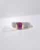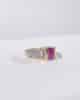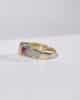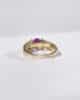 Sublime 18-carat gold ring from the 60s set with an exceptional oval-cut fiery red ruby weighing 1 carat, surrounded on both sides by a white gold band encircled with yellow gold and set with two small brilliant-cut diamonds of 0.01 carats. An elegant and colourful piece, where vibrant ruby red contrasts with yellow and white gold.
