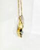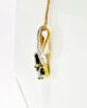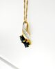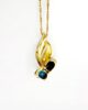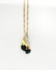 Adorable pendant from the 50s in 18 carat gold set with 2 oval-cut sapphires of 0.35 carats and a sublime indigo blue in a prong setting surmounted by two arabesques, one in yellow gold and the other in white gold with a diamond point motif and set with two small 8×8 diamonds. An elegant and feminine piece to wear every day. Sold without chain.