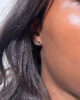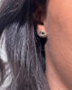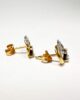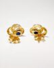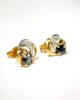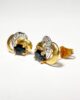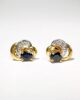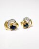 Stunning pair of 18k gold stud earrings from the 60s, each set with 2 0.15 carat oval-cut sapphires in a deep navy blue. Each stone is haloed by mirror-finished yellow gold and white gold scrolls set with a 0.01-carat diamond, bringing contrast and light to the jewel. An elegant piece for everyday wear.