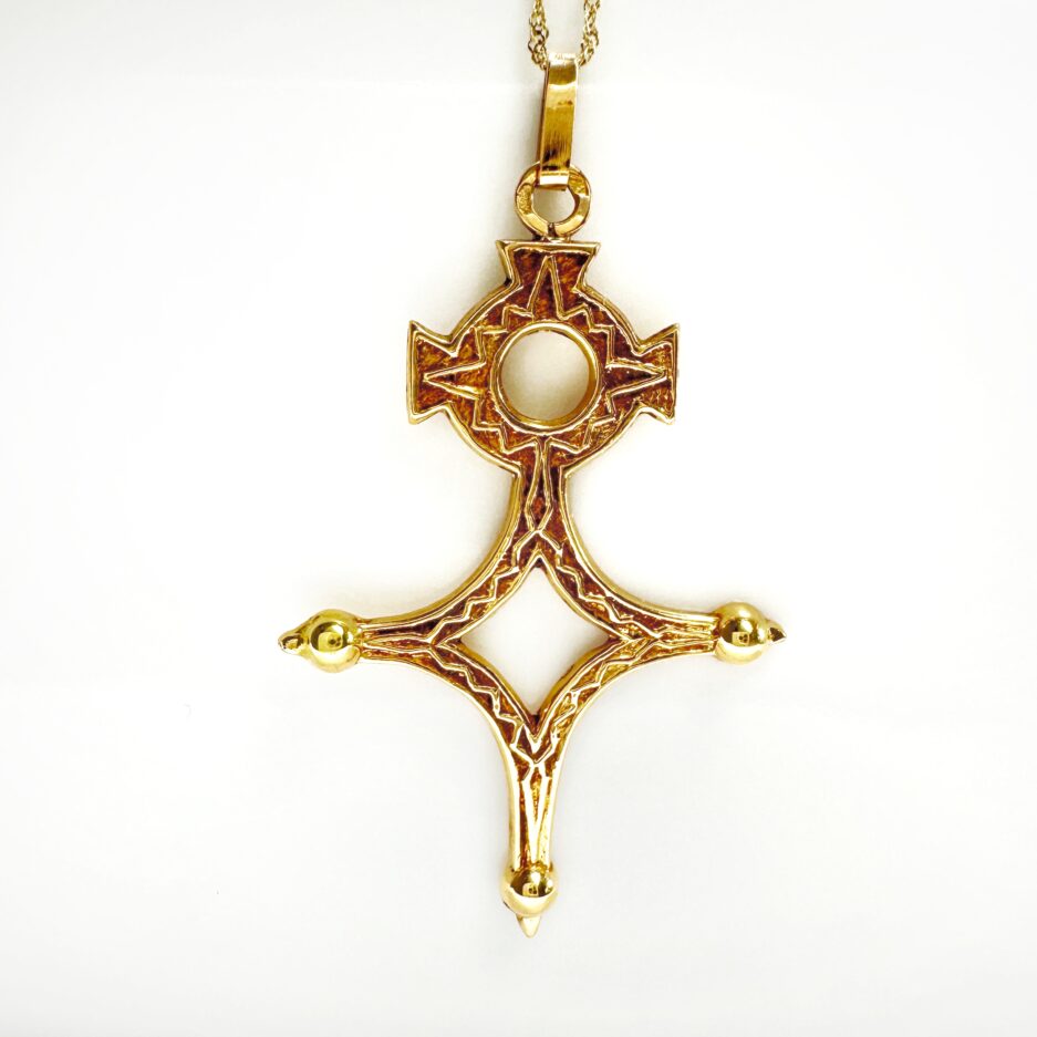 Sublime Agadez cross pendant from the 50s in 18 carat gold representing a southern cross decorated with chiseled motifs, held by a mobile bail. A symbolic piece that is both imposing and very delicate.