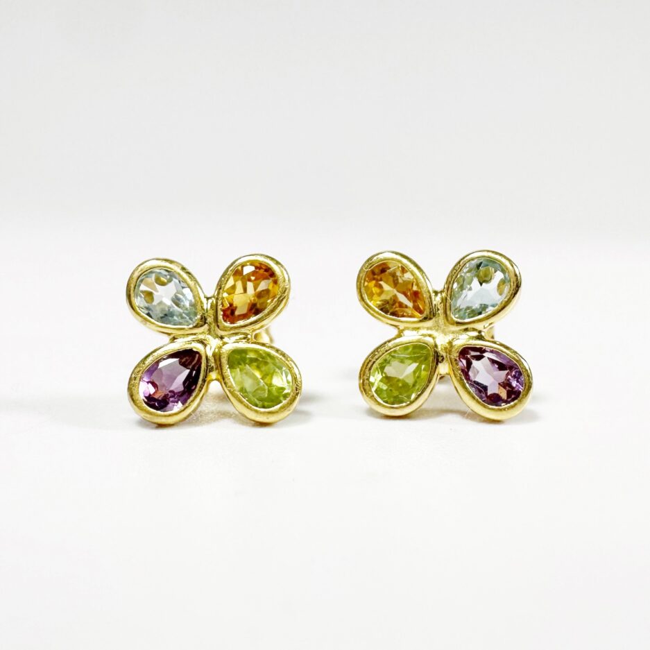 Elegant pair of 18k gold earrings with a four-petal flower motif in yellow gold set with 4 pastel teardrop-cut gems in a bezel setting. A 0.2-carat aquamarine, peridot, citrine and amethyst follow one another for a joyful and elegant effect. The pair is secured with a butterfly clasp for comfortable everyday wear.