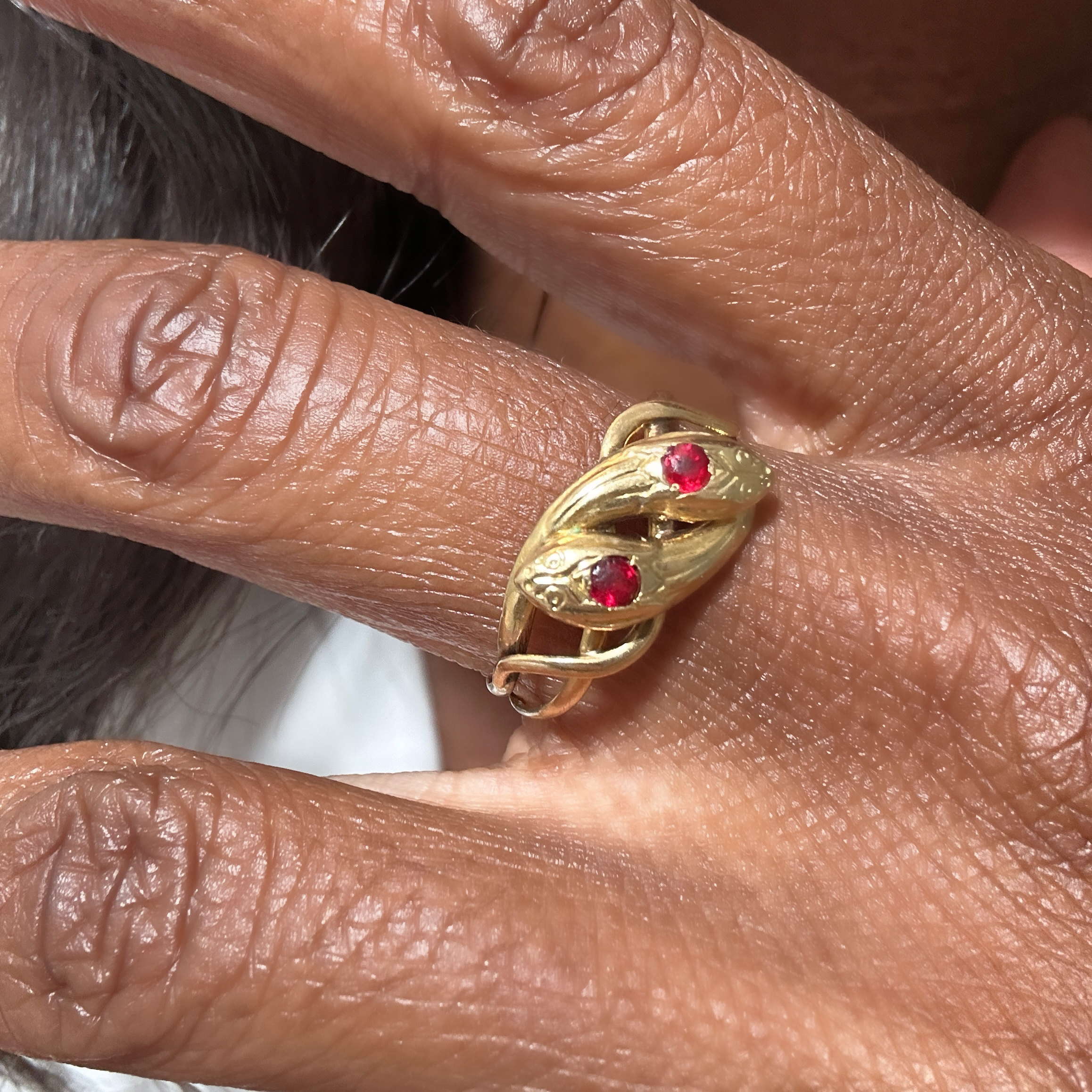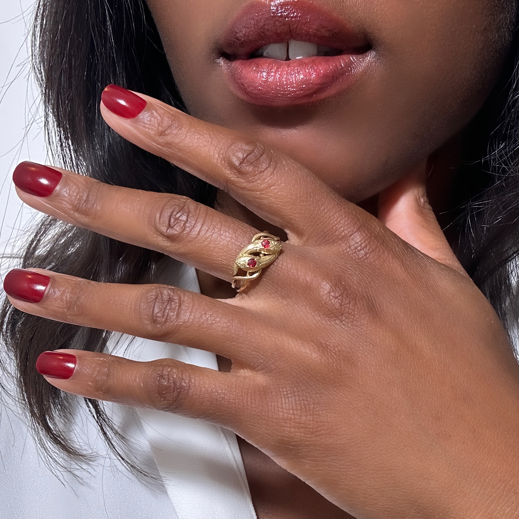 The story: This ring brings together a multitude of symbols: the Toi et Moi ring, the meaning of red tourmaline, and of course, that of the serpent. The first famous Toi et Moi ring was the one offered by Napoleon Bonaparte to Joséphine de Beauharnais as an engagement ring. Since then, this style has become a timeless classic, symbolizing two hearts ready to unite forever. The symbolism of the ring can be personalized depending on the stones paired together: here, the tourmaline, which represents sincere and warm love and is said to encourage emotional communication. The serpent, for its part, is a powerful symbol in many cultures, dating back to Antiquity. It has long been associated with eternal youth and renewal, due to its continuous shedding of skin. In India and South Asia, it is also linked to abundance and, by extension, fertility.
