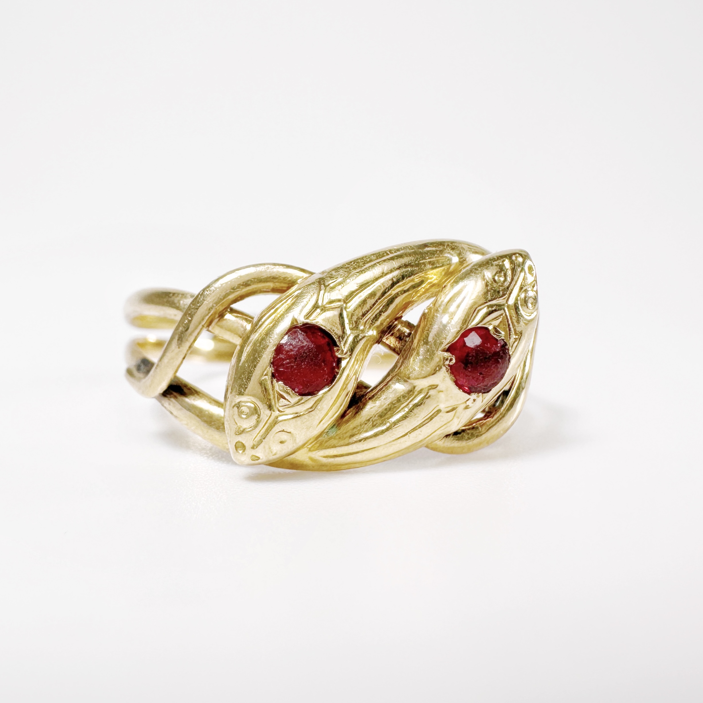 Sublime Toi et Moi ring from the beginning of the twentieth century in 18 carat yellow gold representing two snakes entwined, their crowns respectively set with a garnet, both in round brilliant cuts of 0.2 carats, the facets faded by time for a cabochon effect. A highly symbolic piece where the vibrant blue and red of the two gems contrast with the warmth of the gold.