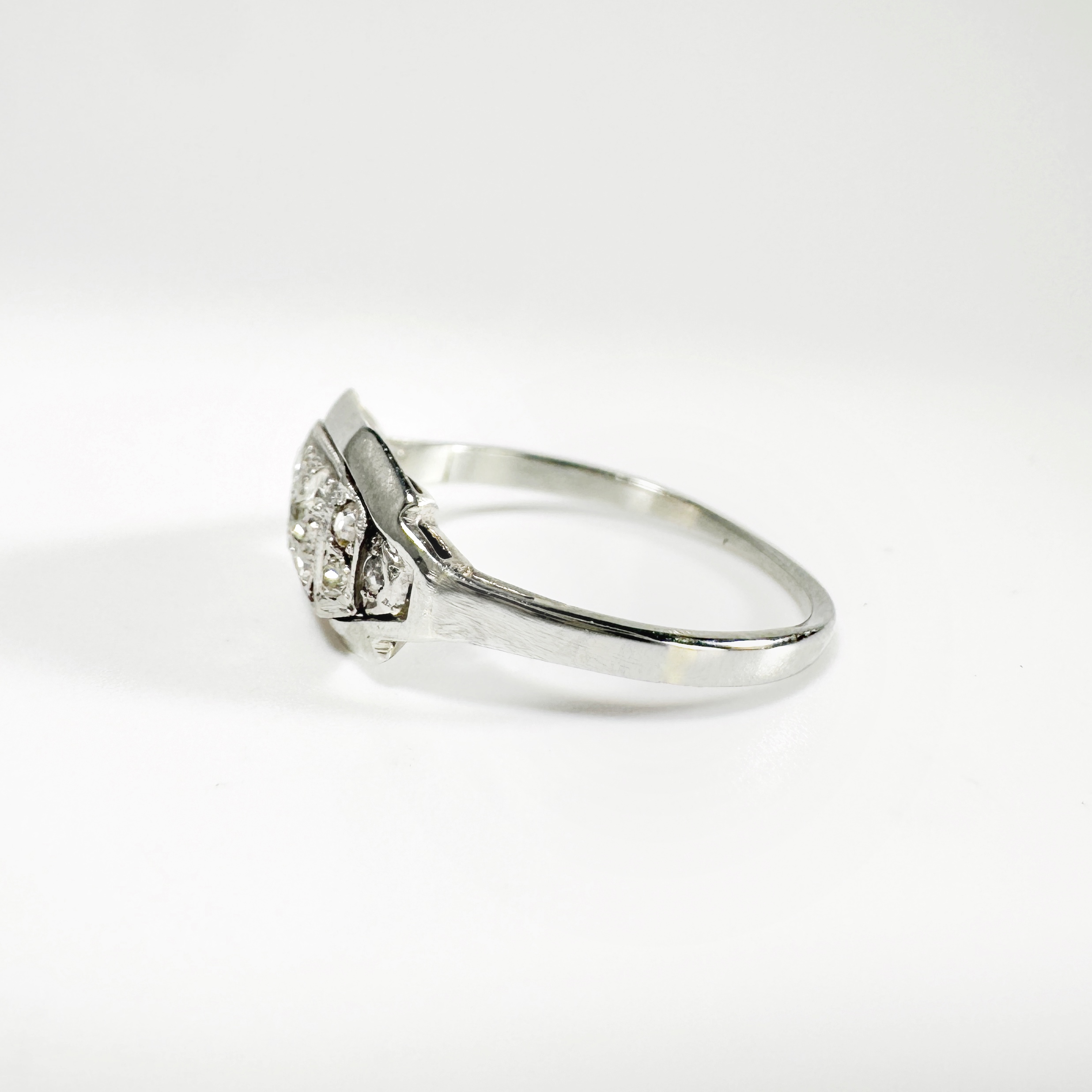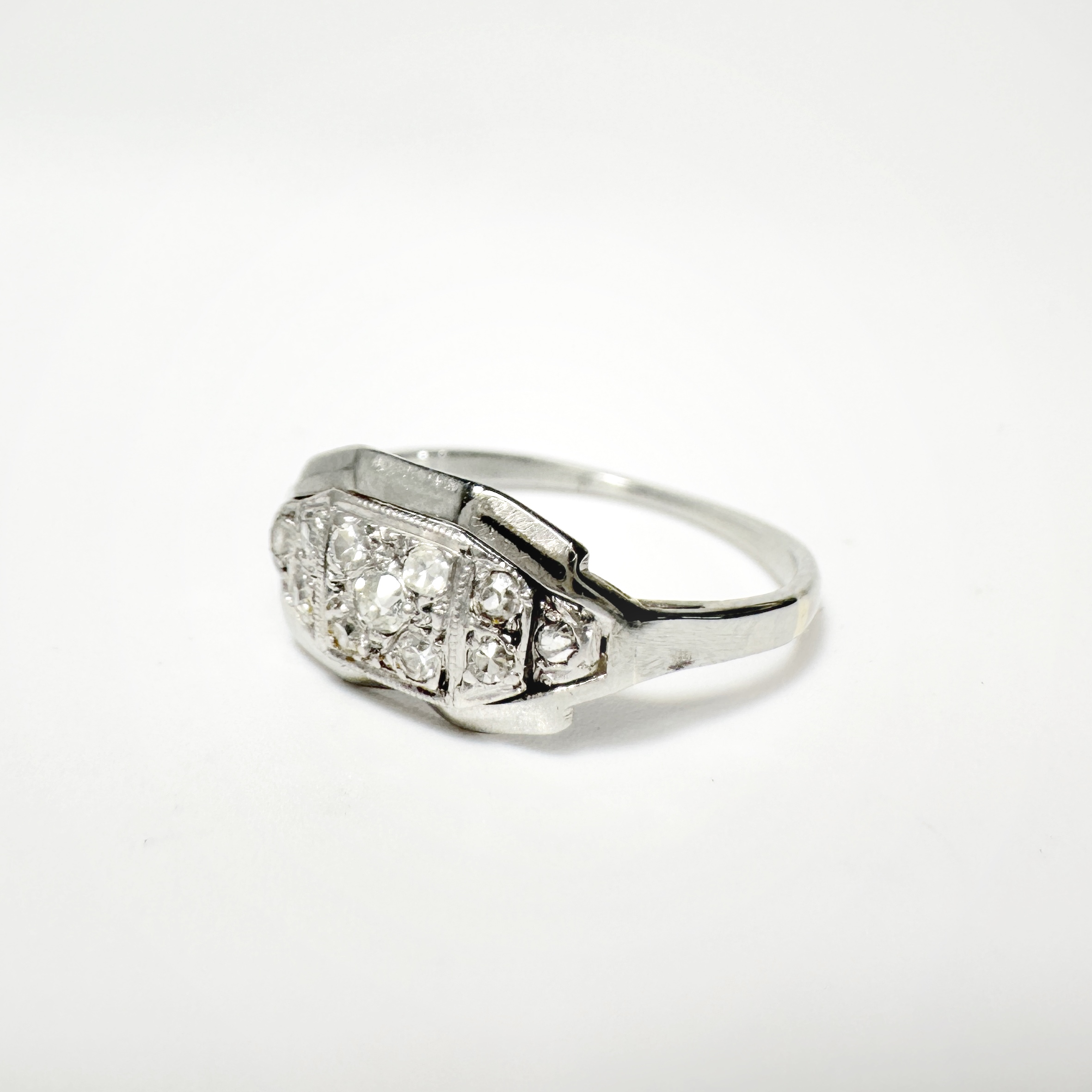 Sublime Art Deco ring in white gold with a rectangle-cut face and shoulders with cut sides, centered with a pavé of 11 brilliant-cut diamonds from 0.05 carats to 0.02 carats in grain setting. An elegant piece with a typical Art Deco design.