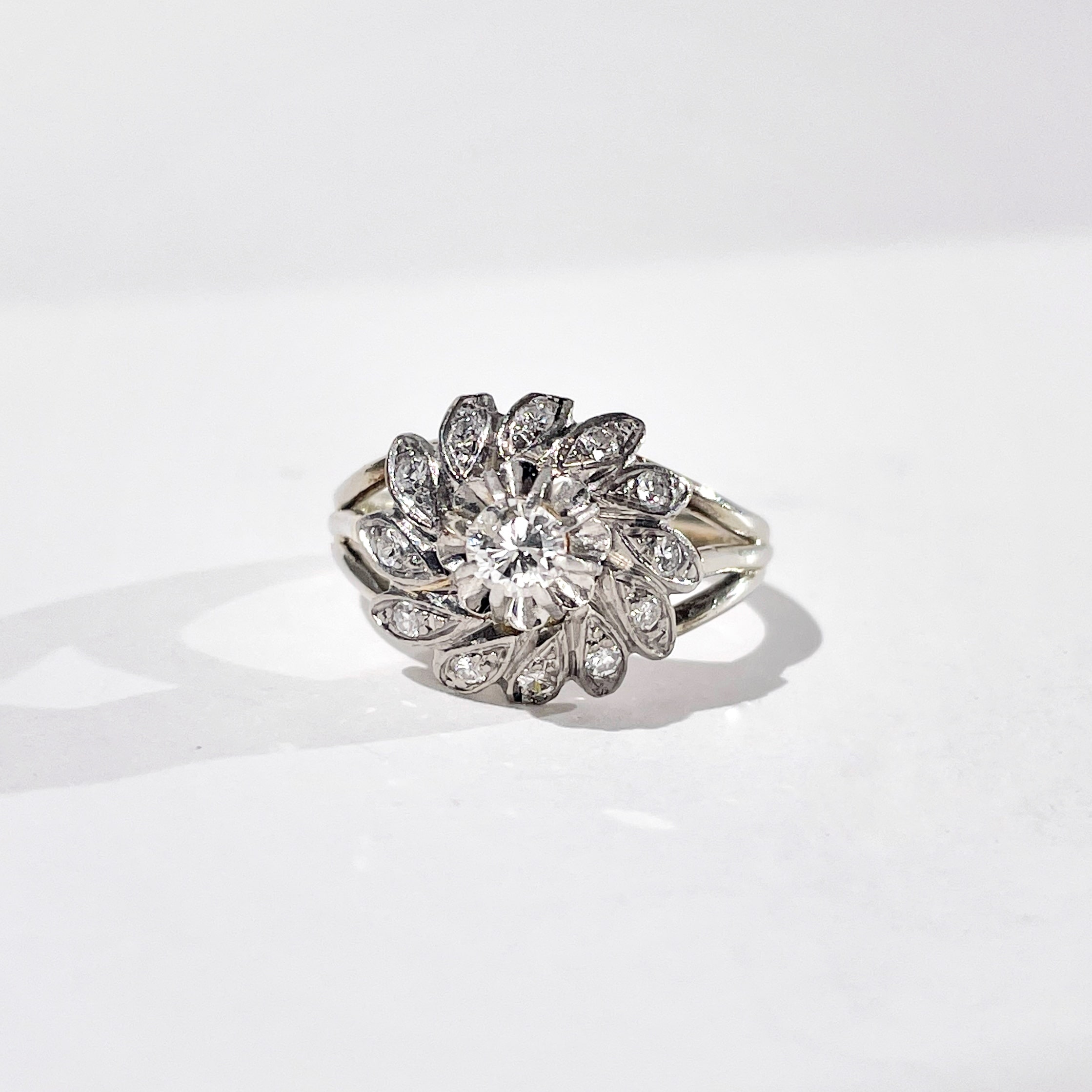 Stunning 18k white gold ring from the 40’s featuring a 0.20ct central diamond surrounded by 12 0.02ct diamonds, each set in the heart of a leaf pattern. Each sparkling leaf surrounds the central diamond set in a claw, for an exceptional sparkle and fire.