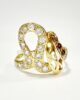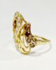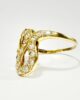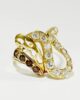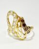 Sublime ring from the 70s in 18-carat yellow gold forming curves and ribbons set with a succession of brilliant-cut gems: 14 white sapphires of 0.15 carats and 4 cognac citrines of 0.1 carat. An original ring full of character where the whiteness of white sapphire contrasts with the warmth of gold and citrine. A piece to adopt without delay to give it a new life.