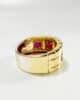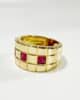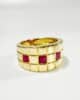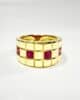 Stunning Art Deco 18k yellow gold ring featuring a “quilted” check pattern set with 4 princess-cut rubies in bezel setting. A piece of character, imposing and sophisticated, to be worn as a style signature on a daily basis.