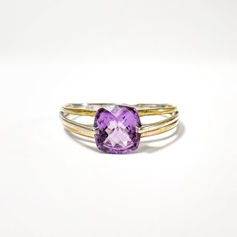 Sublime bague des années 70 en or jaune 18 carats formée de 3 branches, l’un en or jaune, or blanc (central) et or rose se réunissant pour former un anneau unique en or blanc. Au centre de la bague, une améthyste taille coussin briolette est retenue en griffe. D’une belle couleur lavande, la pierre repose sur un chaton ouvert, apportant lumière et couleur à cette bague élégante qui marie harmonieusement 3 tons d’or.