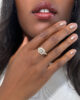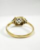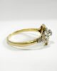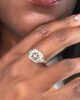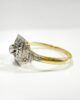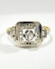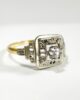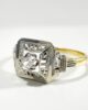 Sublime bague Art Déco en or jaune et blanc à la face taillée en rectangle et aux épaules à pans coupés, centrée d’un saphir blanc taille brillant de 0,1 carat. Serti en griffe, il est encadré de 3 lignes en or blanc ajouré sur un anneau en or jaune. Une pièce élégante au dessin typique de l’époque Art Déco.