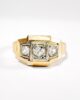 Sublime bague Art Déco en or jaune et blanc à la face taillée en rectangle et aux épaules rectilignes, centrée de trois sublimes saphirs blancs, un central de 0,05 carats et deux périphériques de 0,04 carats. Ces gemmes en serti grain sont encadrés de lignes travaillées en pointillés en or blanc, contrastant subtilement avec l’or jaune de l’anneau. Une pièce élégante au dessin typique de l’époque Art Déco.