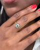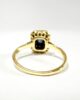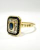 Sublime bague des années 30, époque Art Déco, en or 18 carats centrée d’un saphir taille ovale de 0,4 carats, entouré d’un halo étincelant de diamants de 0,02 carats. Ce halo est lui-même cerclé d’un cadre géométrique formé de saphirs calibrés et d’un liseré en or miroitant. Centré sur un anneau à épaules ciselées, cette pièce élégante présente un dessin typique de l’époque Art Déco.