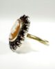 Sublime bague du XIXème siècle formée d’un anneau en or jaune 18 carats centrant un camée sur coquillage auréolé de 14 grenats taille brillant de 0,2 carat et d’un rouge profond sertis sur un chaton en argent. Une bague mariant le style classique du camée et l’originalité d’un entourage de grenats pour un effet des plus saisissants.
