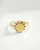 Elégante bague style chevalière des années 80 en or 18 carats sertie montée d’un plateau miroitant auréolé d’une plaque d’or ciselé qui accroche la lumière à chaque mouvement. Une pièce à la fois minimaliste et sophistiquée, lumineuse et raffinée.