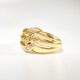 Elégante bague en or 18 carats des années 50 présentant un anneau formé de trois lignes courbes en or jaune au centre desquelles se succèdent 3 arabesques centrées d’un petit diamant brillant en serti grain sur or blanc. Les trois lignes entrelacées laissent entrevoir la peau, apportant légèreté à cette bague imposante. Une pièce féminine à porter au quotidien.