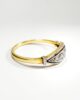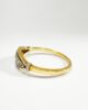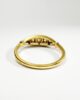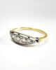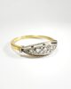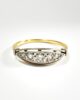 Sublime bague jarretière datant du début du XXème siècle en or 18 carats serties de 5 diamants taille ancienne en serti grain sur or blanc. Le diamant central, pesant 0.05cts est entouré de part et d’autre d’un diamant taille brillant de 0,03 et 0,02 carats, tous étant taille brillant avec une clarté VVSI et un couleur F (quasi incolore). Une pièce classique et intemporelle à la fois, à porter au quotidien seule ou en layering avec d’autres pièces.