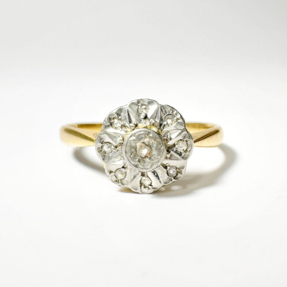 L’histoire: Très en vogue sous le Second Empire, les bagues dites marguerite séduisaient par leur délicatesse et leur équilibre. Souvent offertes en gage d’amour ou de fiançailles, elles reflétaient la mode romantique du XIXᵉ siècle, où l’on appréciait les compositions circulaires évoquant la pureté et l’élégance féminine. Popularisées par l’impératrice Eugénie et son goût pour les bijoux raffinés, elles devinrent des pièces emblématiques de la joaillerie de l’époque.