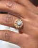 Sublime bague marguerite des années 40 en or 18 carats sertie d’un saphir blanc taille brillant central de 0,15 carats auréolé de d’un halo en or jaune facetté en éventail. De part et d’autre du motif central, trois branches se réunissent en un seul anneau. Une pièce lumineuse et scintillante au charme typique des années 40.
