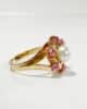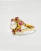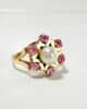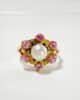 Somptueuse bague marguerite des années 40 en or jaune 18 carats sertie d’une perle de culture auréolée de 6 saphirs roses taille brillant de 0,1 carats. D’un blanc lumineux, la perle est réhaussée par la chaleur d’un chaton en or jaune formant une étoile miroitante sur son contour. Une bague féminine et délicate aux teintes pastel, toute en douceur et en lumière.