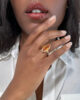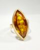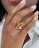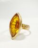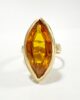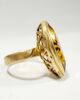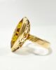 Sublime bague des années 50 en or jaune 18 carats sertie d’une magnifique citrine taille navette ou marquise de 6 carats en serti clos. D’une sublime couleur jaune orangée, la pierre est montée sur un chaton ciselé d’arabesques et sur un anneau aux épaules ciselées. Une bague au style de caractère, lumineuse et élégante, à adopter sans attendre pour lui donner une nouvelle vie.
