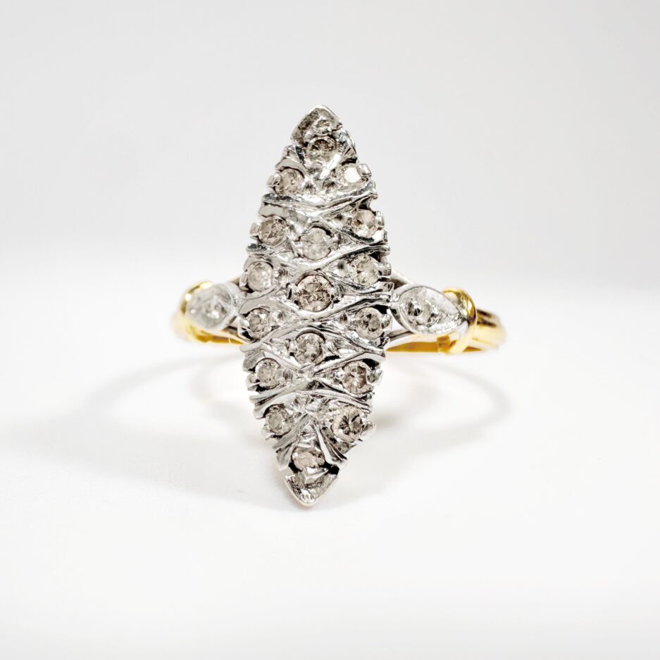 Sublime bague marquise du début XXème siècle en or 18 carats pavée de 17 petits diamants de 0,01 à 0,02carats en serti grain sur une navette en or blanc, épaulée de deux motifs de feuilles eux-mêmes sertis chacun d’un diamant taille brillant de 0,01 carats. Montée sur un anneau en or jaune rainuré, la navette blanche et lumineuse contraste joliment avec la chaleur de l’or jaune. Une pièce classique du répertoire de la joaillerie ancienne, hautement symbolique et appréciée pour l’effet allongeant qu’elle apporte au doigt.