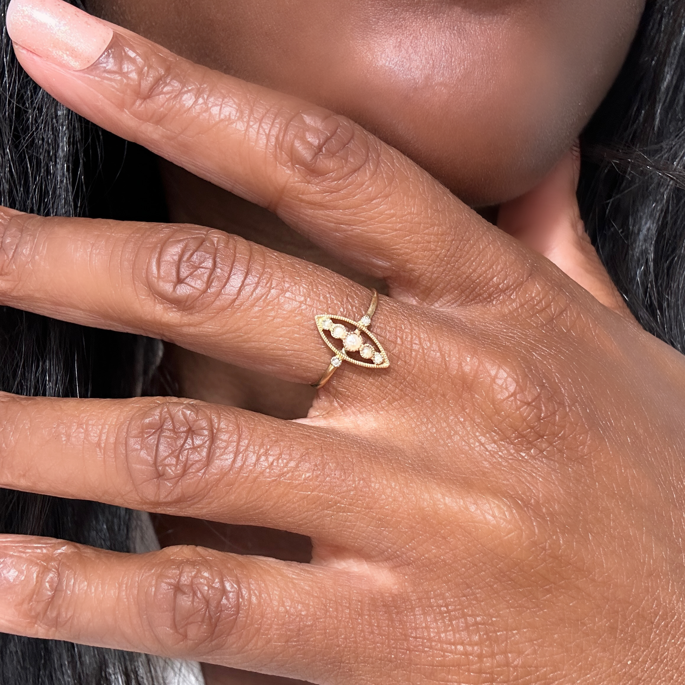 L’histoire : Élégante et allongée, la bague marquise se distingue par sa pierre aux extrémités effilées, dont la silhouette évoque un sourire délicat. Selon la tradition, cette forme aurait été inspirée par le sourire de la marquise de Pompadour, favorite du roi Louis XV, qui souhaitait une pierre à son image : gracieuse, raffinée et inoubliable. Depuis le XVIIIe siècle, la coupe marquise traverse les époques avec audace et sophistication. Elle séduit par son allure royale et sa capacité à sublimer la main avec élégance. Aujourd’hui encore, la bague marquise demeure un choix singulier et affirmé, symbole de caractère, de distinction et d’un amour qui ne ressemble à aucun autre.