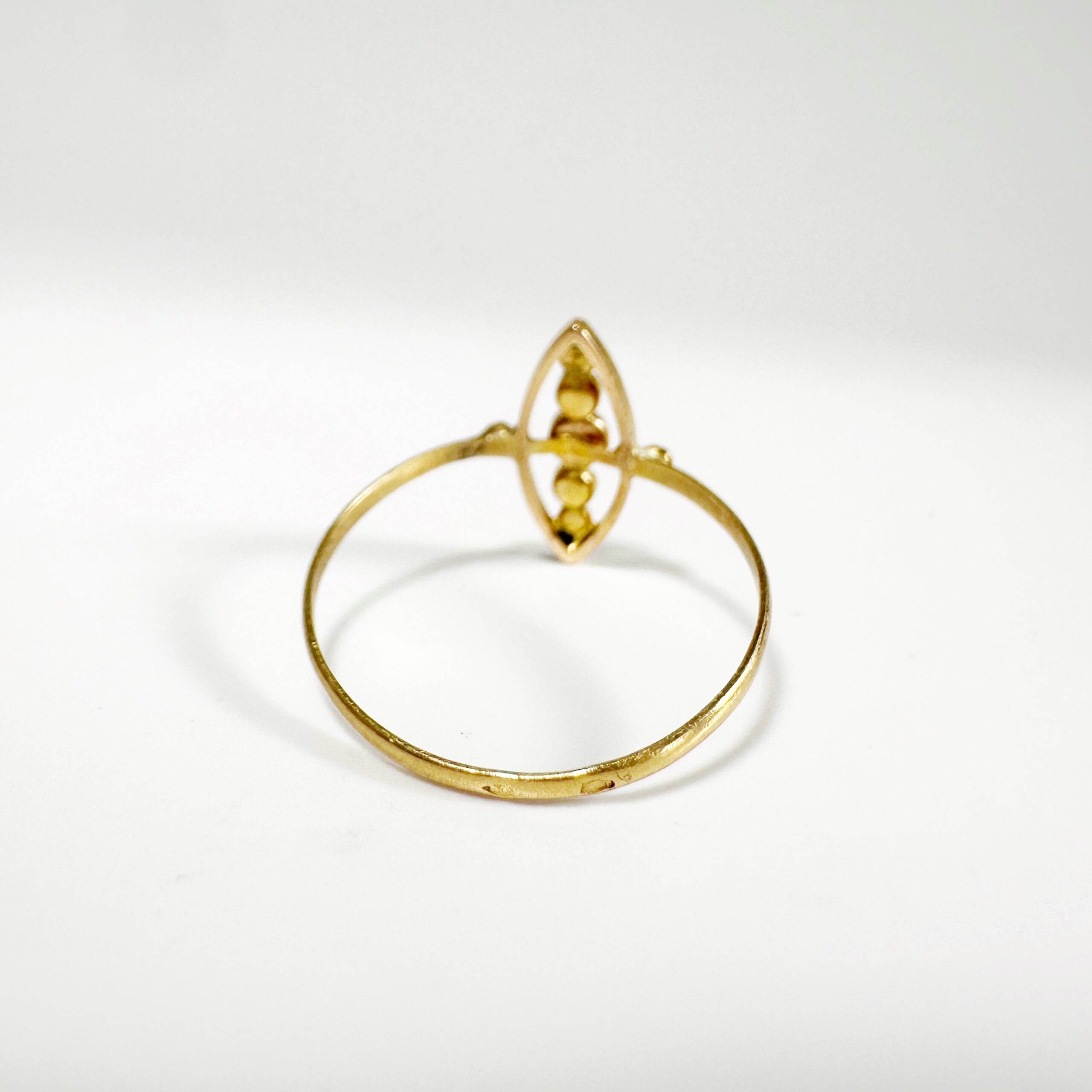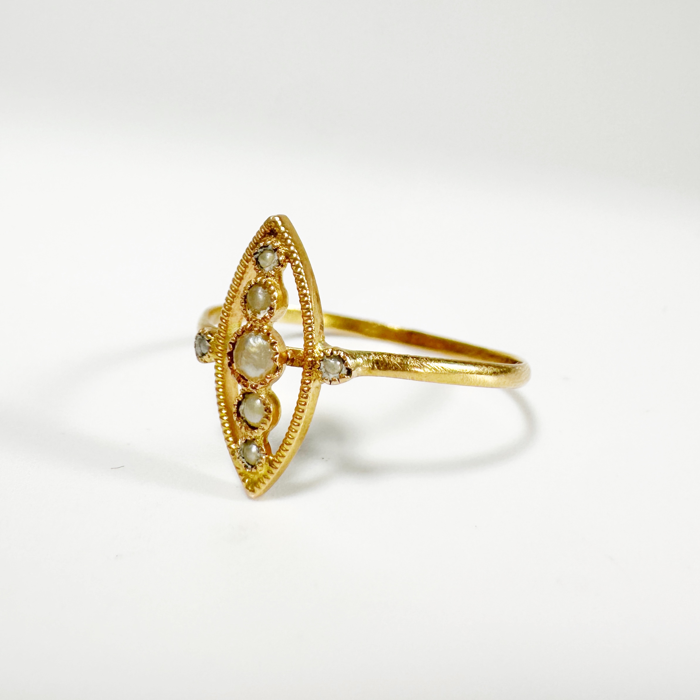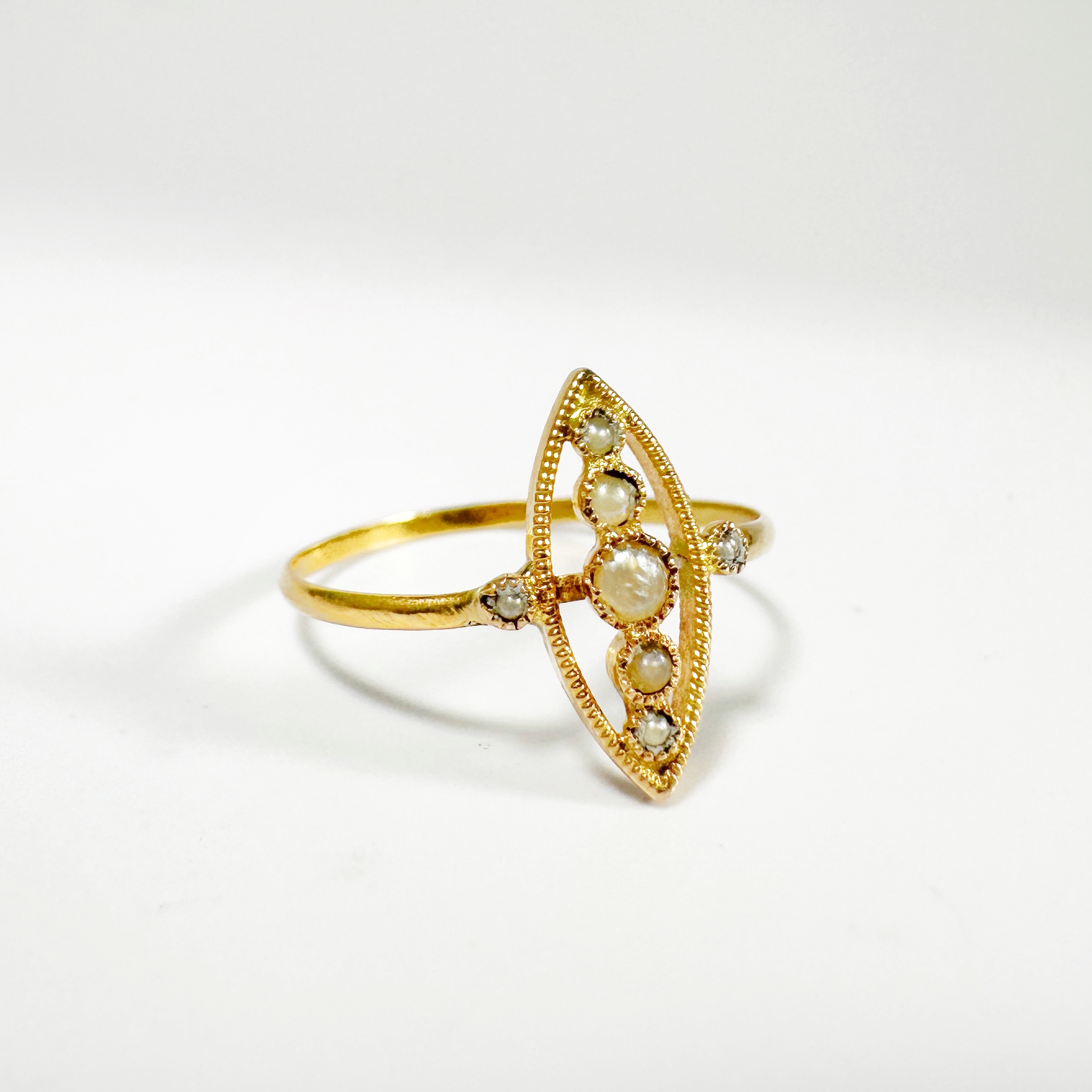 Sublime bague du XIXème siècle (époque Bonaparte) en or 18 carats de style marquise. Formée d’une rangée de demi perles fines cerclées d’or travaillé en billes d’or au centre d’un motif ciselé en forme de navette laissant entrevoir la peau. Ce motif, centré sur un anneau fin ponctué de deux demi perles, forme une pièce toute en légèreté où le contraste de l’or jaune sublime la blancheur de la perle.