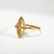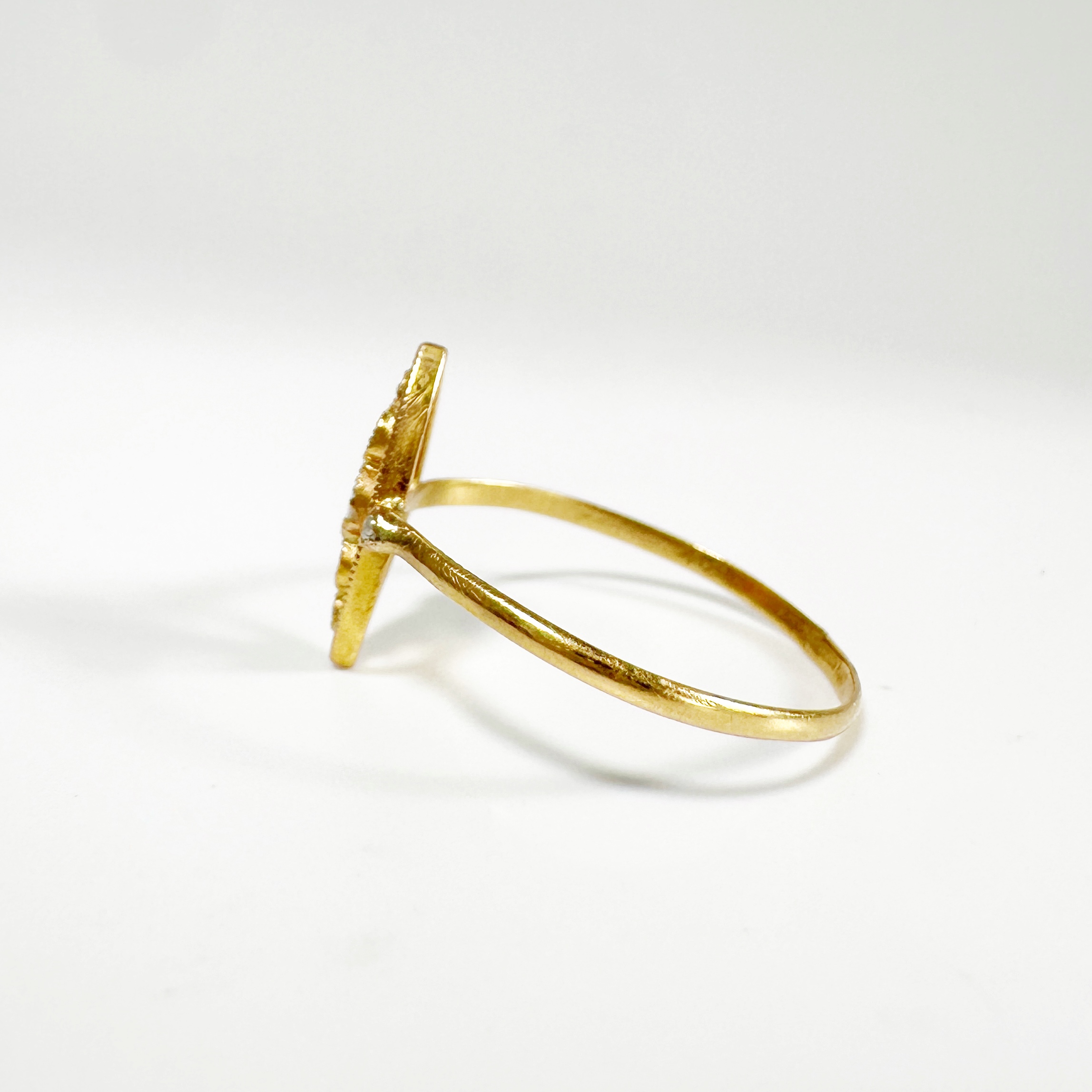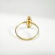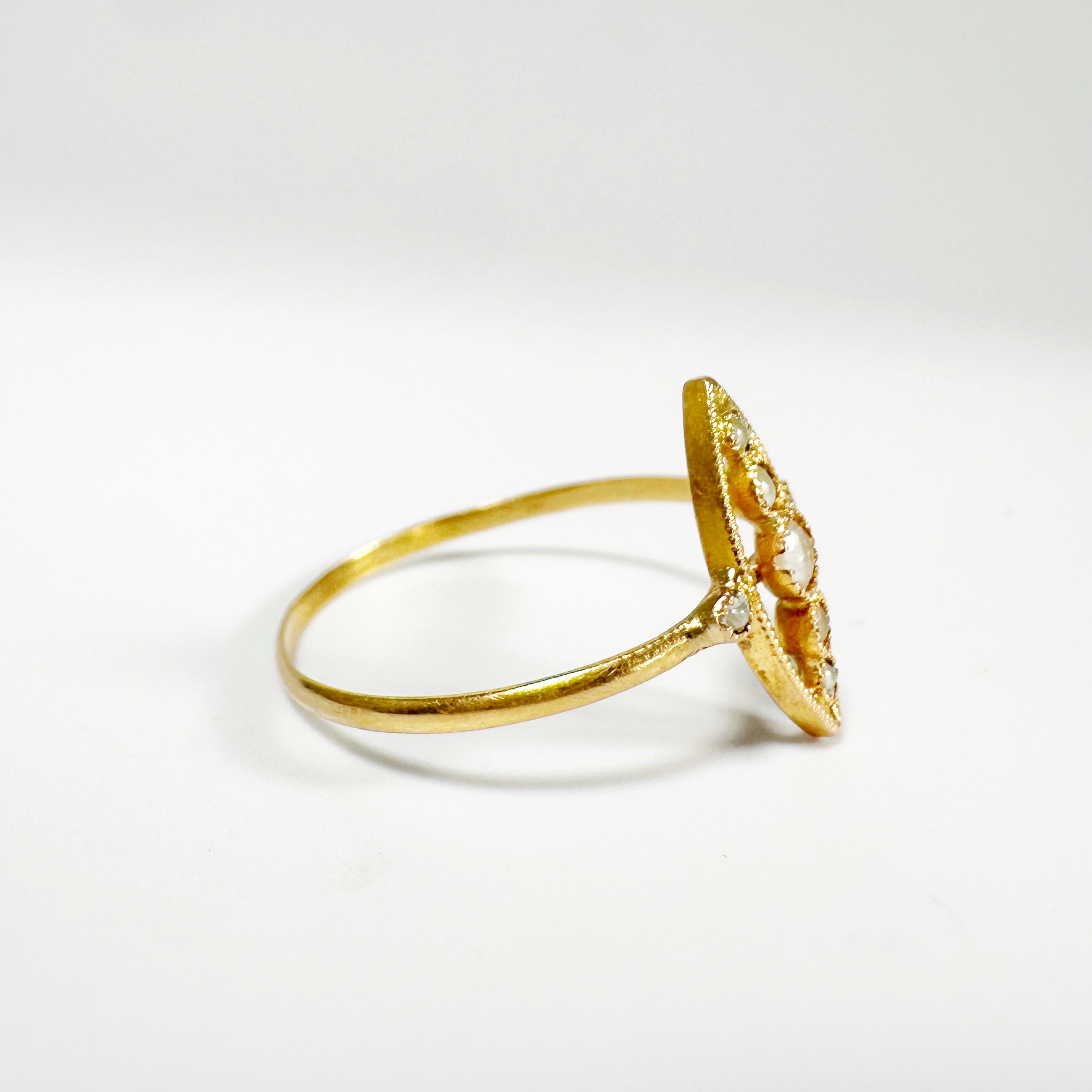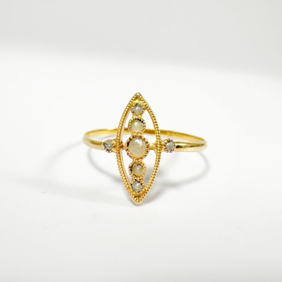 Sublime bague du XIXème siècle (époque Bonaparte) en or 18 carats de style marquise. Formée d’une rangée de demi perles fines cerclées d’or travaillé en billes d’or au centre d’un motif ciselé en forme de navette laissant entrevoir la peau. Ce motif, centré sur un anneau fin ponctué de deux demi perles, forme une pièce toute en légèreté où le contraste de l’or jaune sublime la blancheur de la perle.