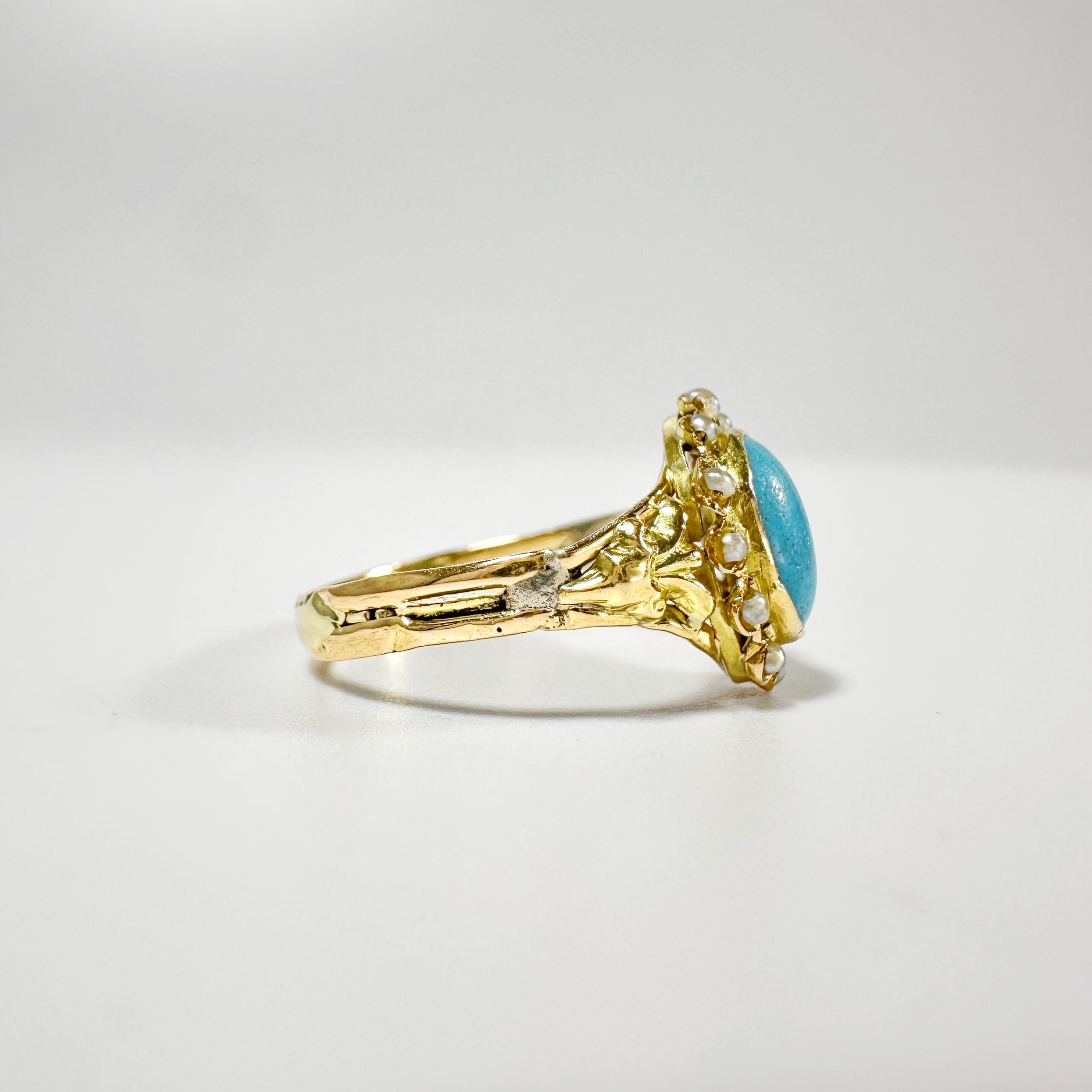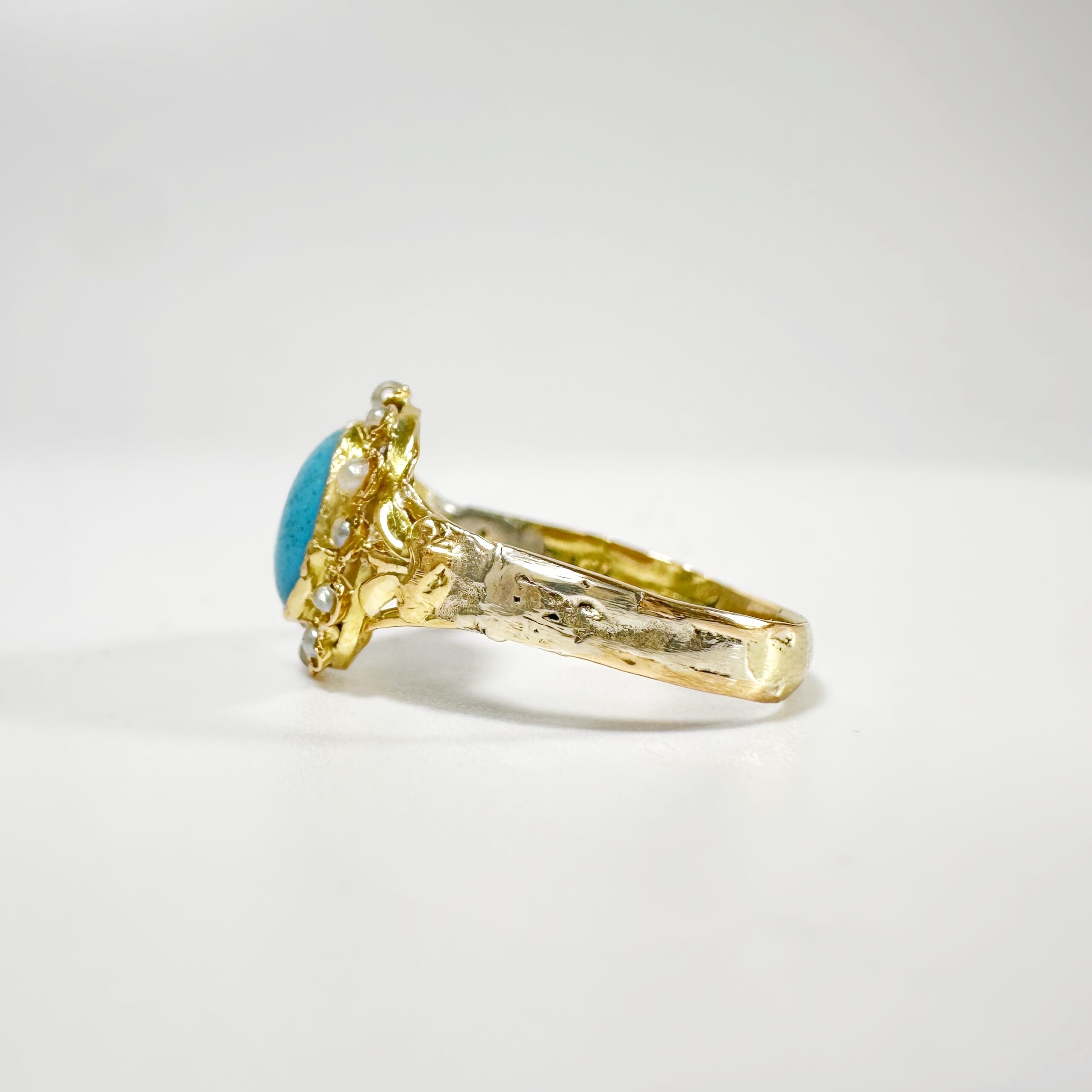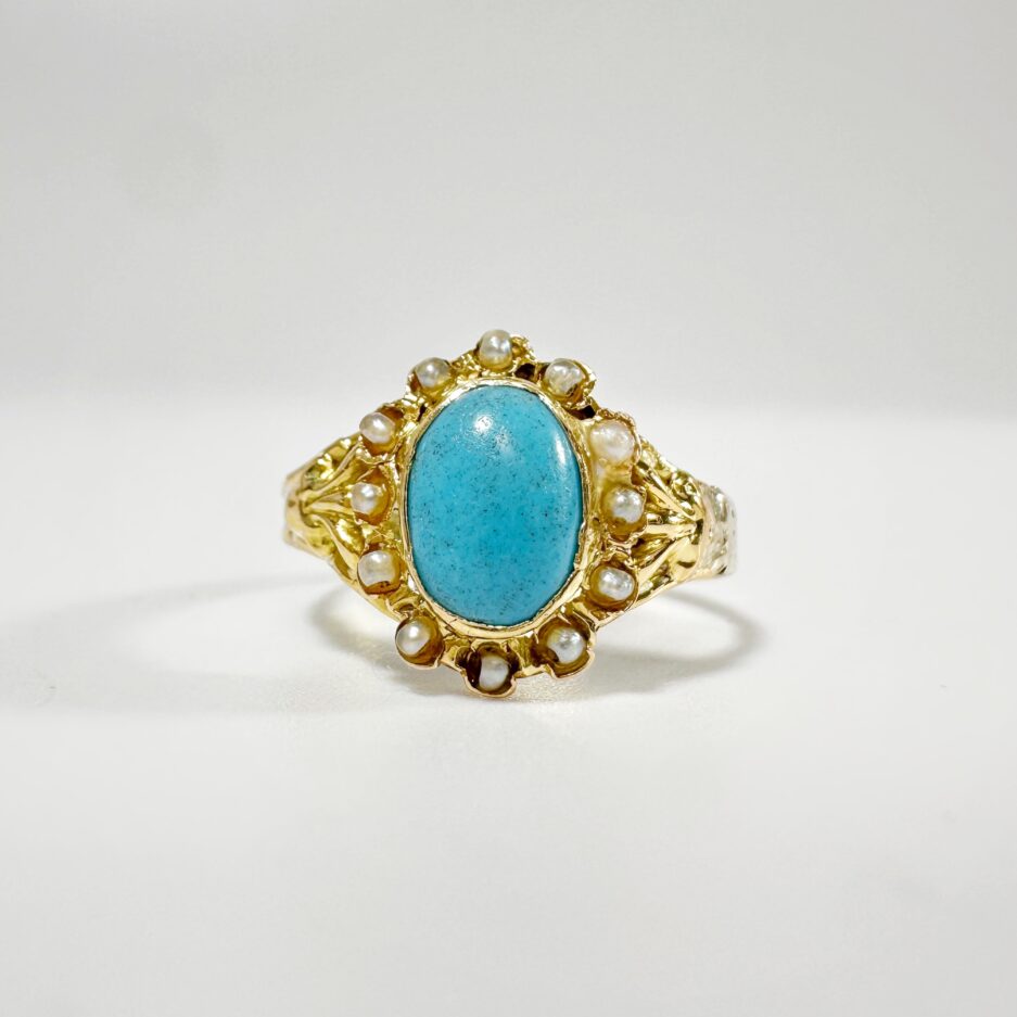 Sublime bague du milieu du XIXème siècle en or 18 carats présentant un sublime cabochon de turquoise ovale de 1,2 carat en serti clos auréolé de 12 demi perles fines. Ce motif est centré d’un motif de fleur de lys de part et d’autre sur un anneau simple en or jaune restauré présentant des irrégularités, témoins de l’histoire ancienne de ce bijou,