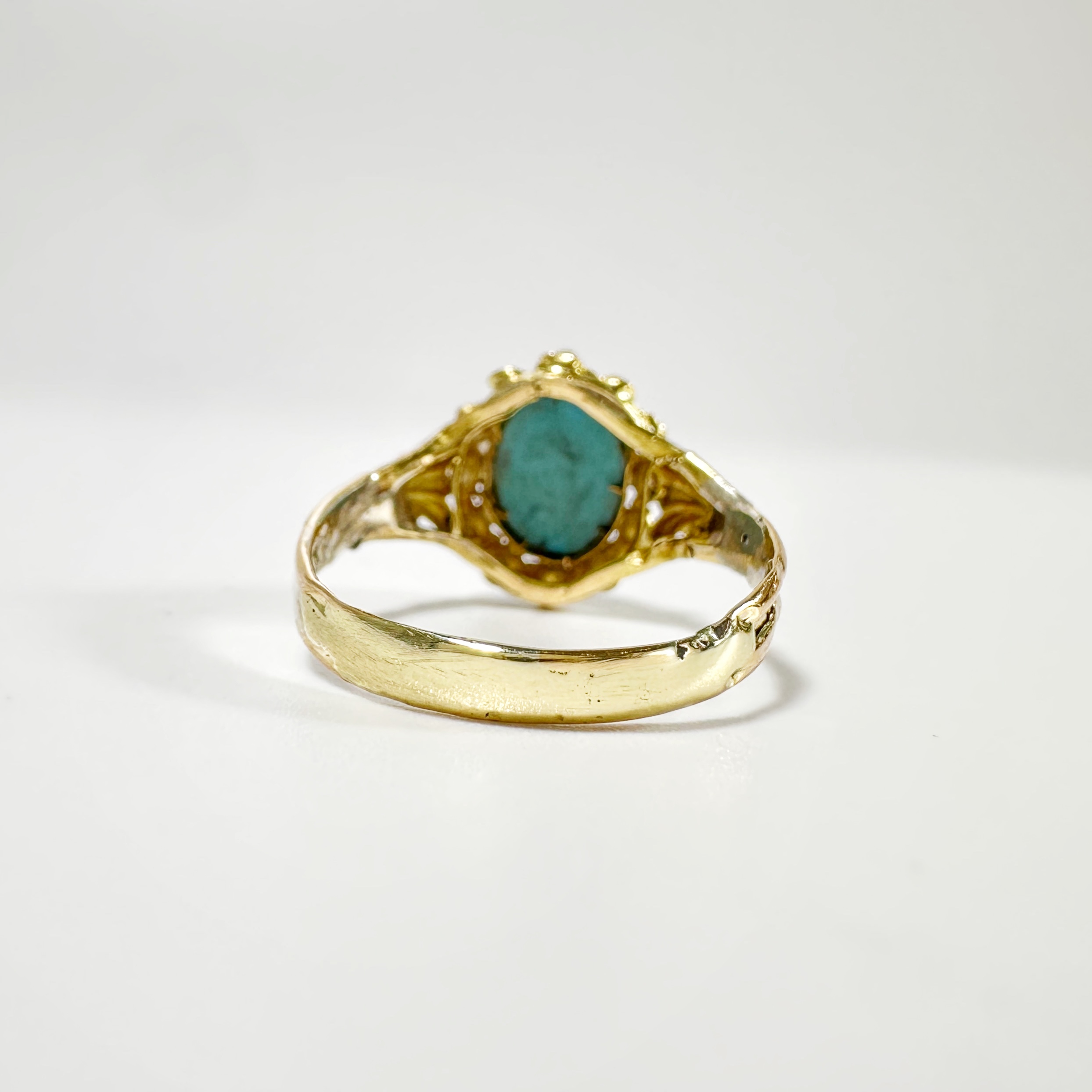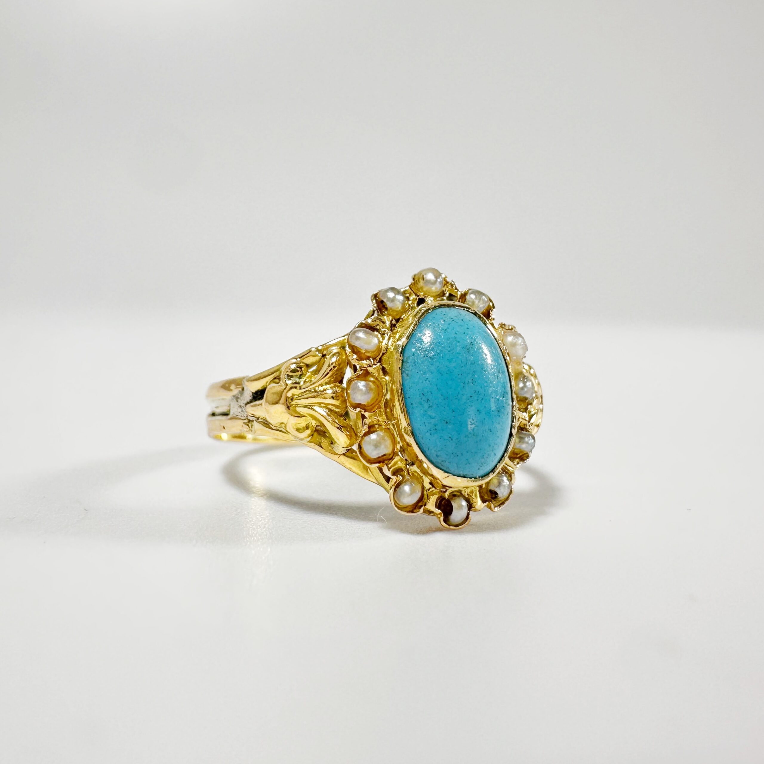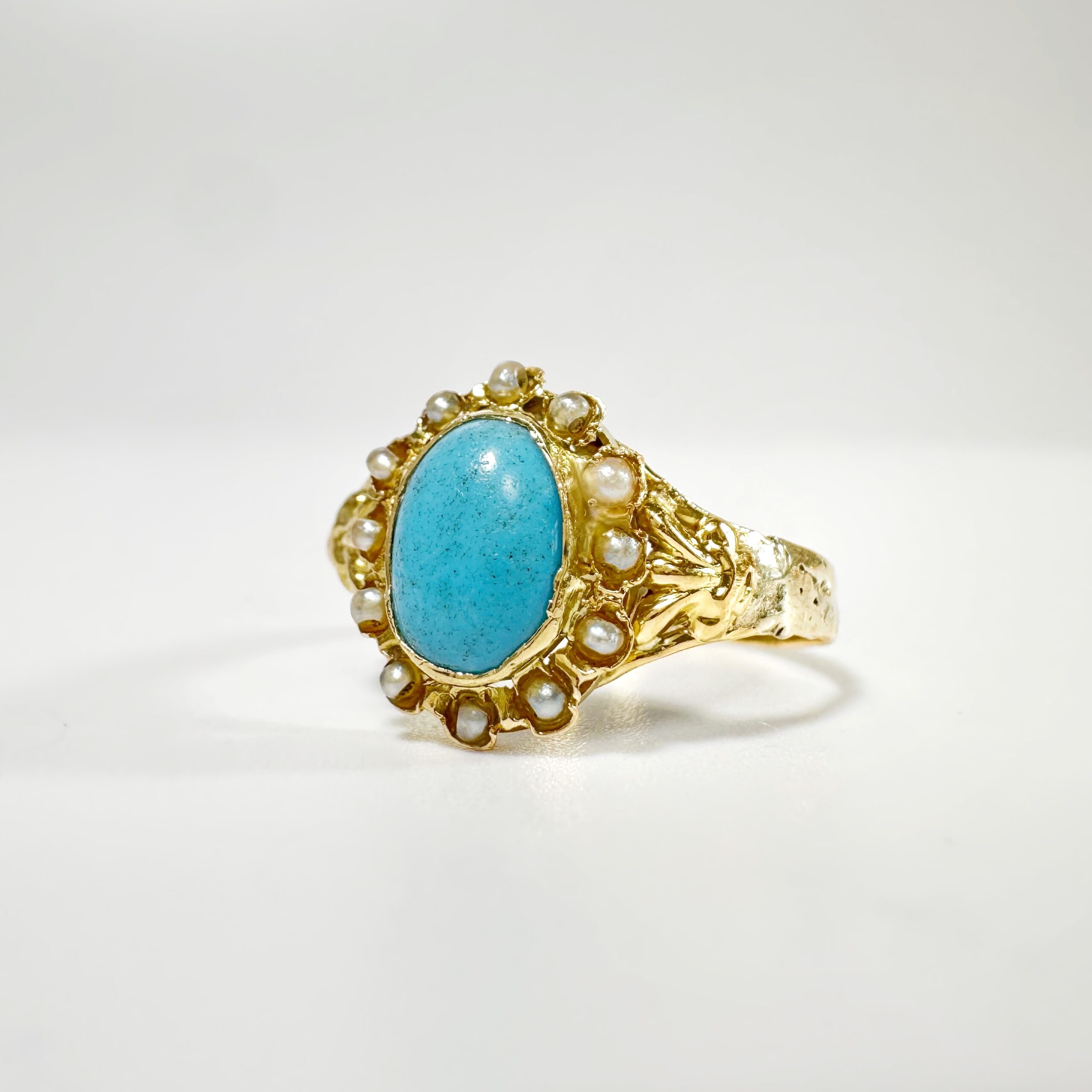 Sublime bague du milieu du XIXème siècle en or 18 carats présentant un sublime cabochon de turquoise ovale de 1,2 carat en serti clos auréolé de 12 demi perles fines. Ce motif est centré d’un motif de fleur de lys de part et d’autre sur un anneau simple en or jaune restauré présentant des irrégularités, témoins de l’histoire ancienne de ce bijou,