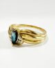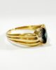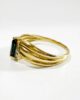 Sublime bague des années 50 en or 18 carats composée de trois lignes godronnées au centre desquelles est serti en griffe un beau saphir taille navette de 0,4 carats sur or blanc. De part et d’autre de ce saphir sont sertis un diamant taille brillant de 0,01 carat, apportant contraste et éclat à la pierre d’un bleu océan profond.