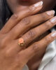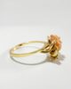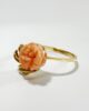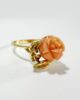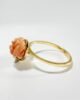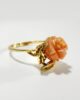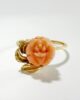 Sublime bague des années 50 en or jaune 18 carats centrée d’un corail taillé en fleur de rose et entouré de motifs de feuillages ciselés dans l’or. D’une délicate teinte pêche, la pierre de corail est réhaussée par la chaleur de l’or jaune pour une pièce romantique et colorée.